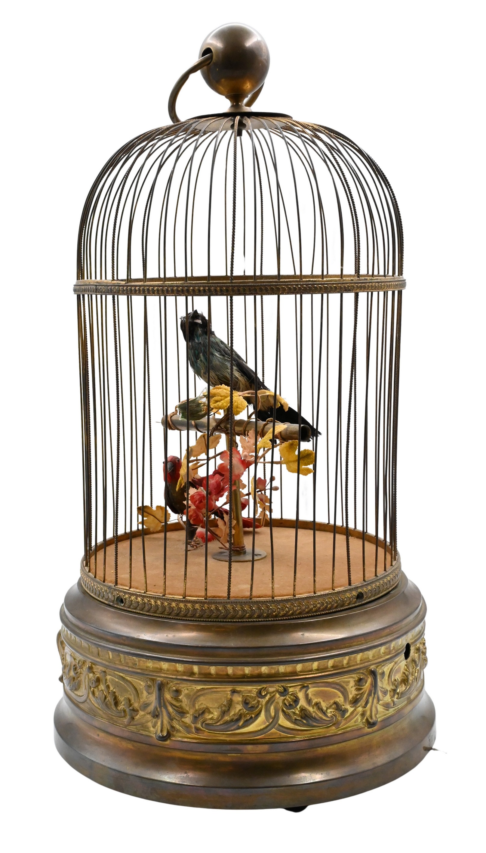 gilt-brass bird cage automaton featuring two feathered birds perched on a naturalistic branch, one in bright red plumage and the other in blue, the cylindrical gilt-metal base is richly cast with scrolling acanthus ornament, supporting a domed cage with ring handle, when wound, the birds move and “sing” via internal bellows and clockwork mechanism marked on base “Made in France” with serial number 321