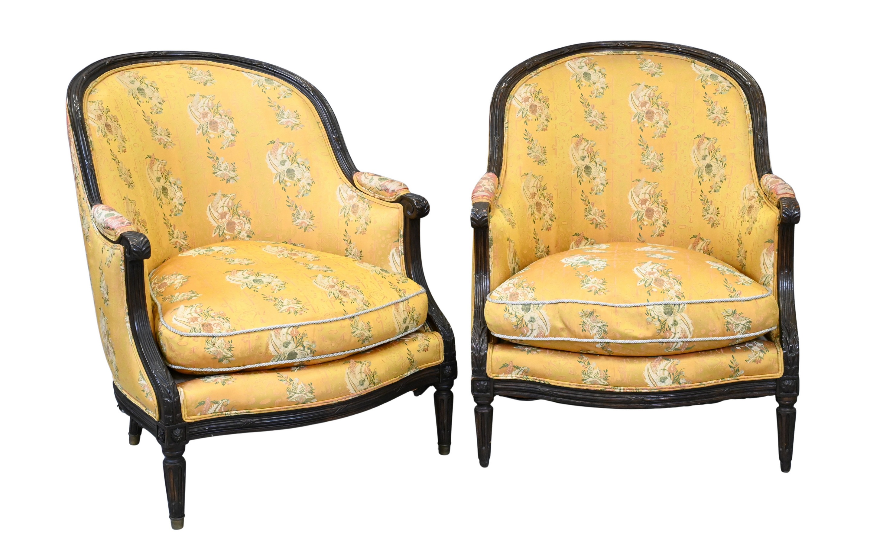 each with arched back, molded frame, and fluted legs, upholstered in yellow floral patterned silk with loose seat cushions and piped trim, the frames in dark painted finish with carved rosettes and foliate details, circa 1900