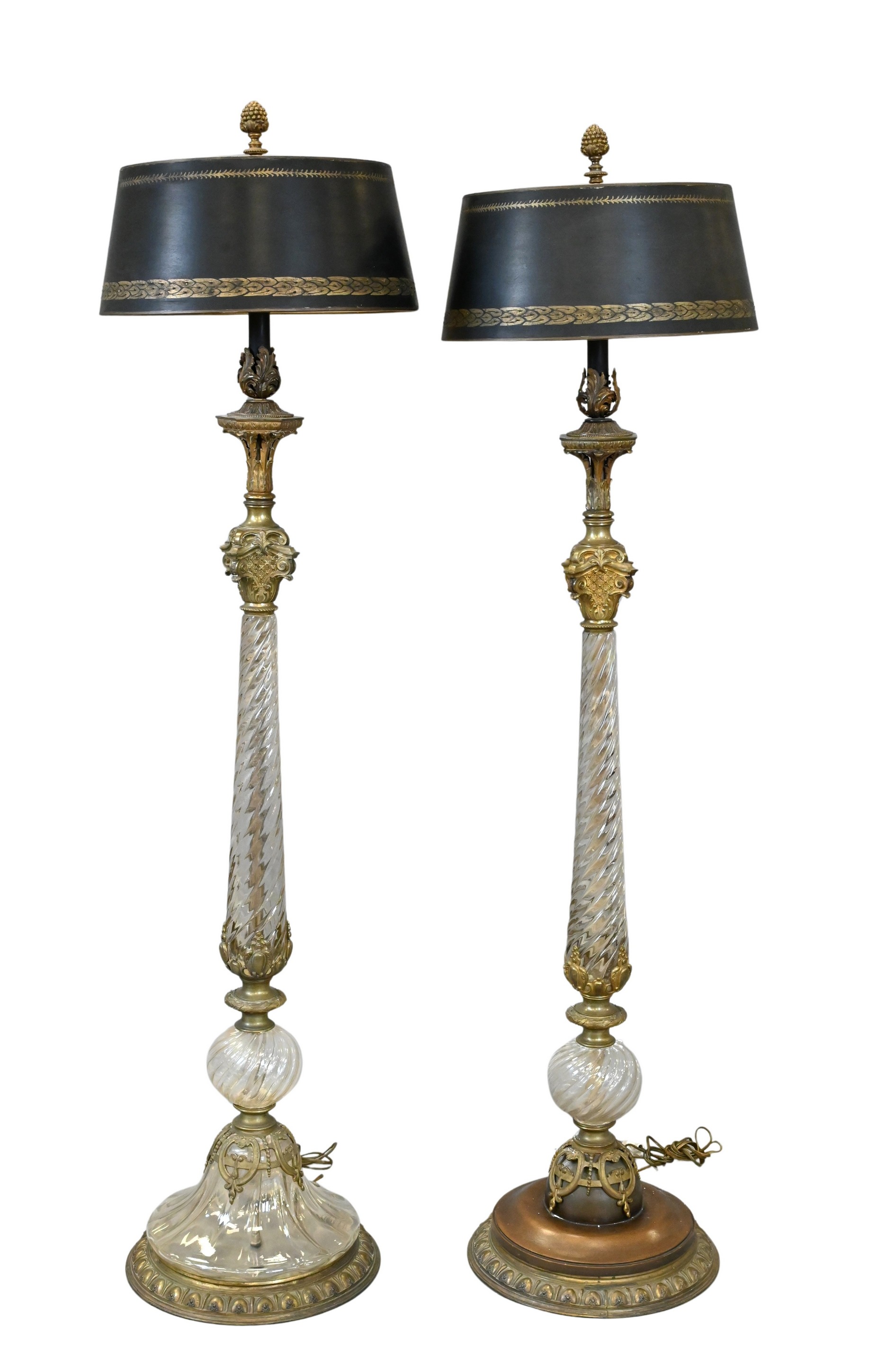 each with a spirally fluted crystal shaft mounted with finely cast bronze foliate and latticework ornament, surmounted by a finial in the form of a cluster of berries, and raised on a large circular base with gadrooned edge; one retains original glass base, the other with later wood base, early 20th century