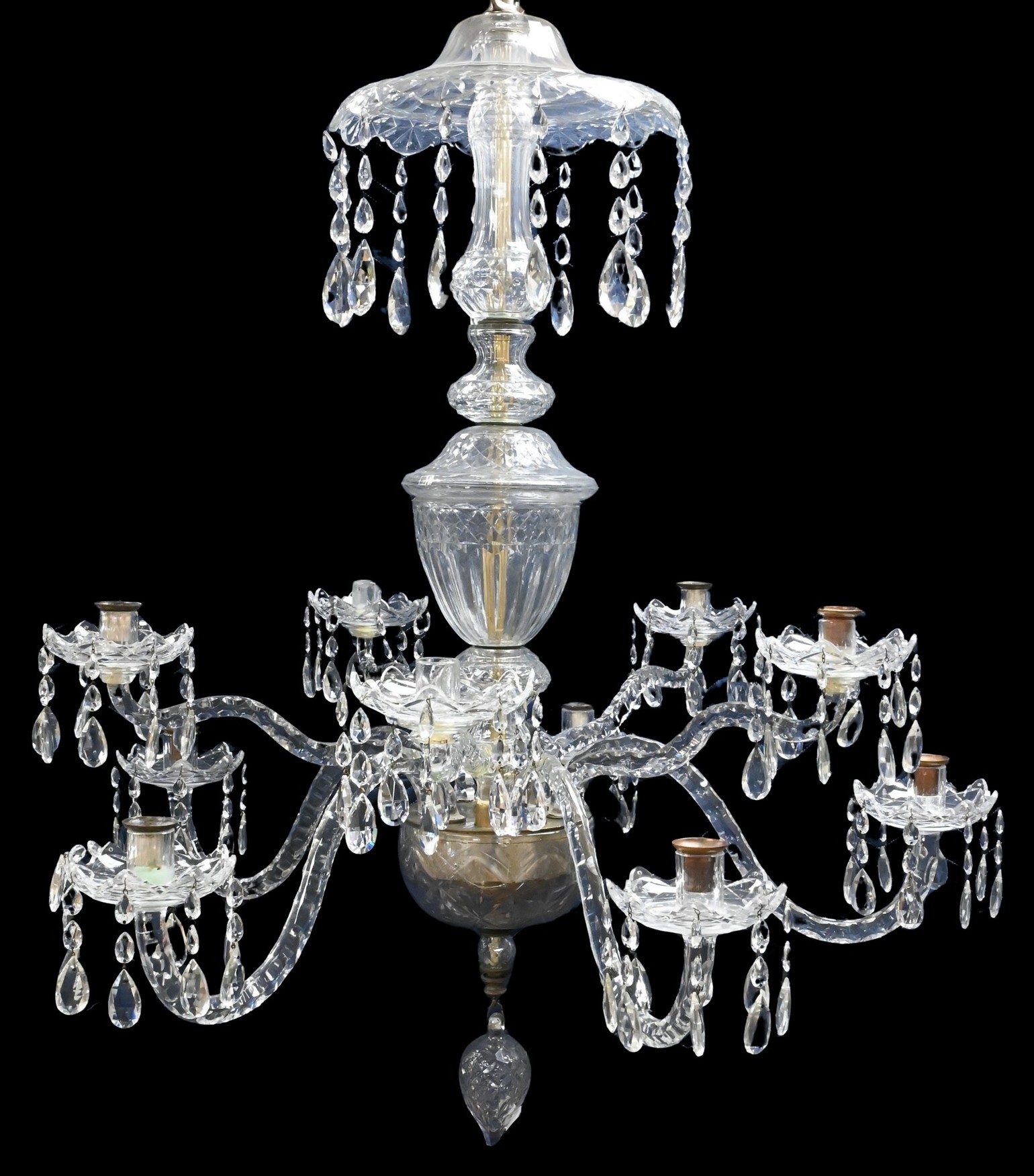 Baluster-form central column composed of finely cut crystal elements, issuing eight sweeping crystal arms, each supporting a scalloped bobeche hung with faceted teardrop prisms. Additional cascades of cut crystal drops adorn the upper canopy and the deeply engraved lower bowl, which terminates in an elongated faceted pendant. Brilliant clarity throughout with well-matched hand-cut components and elegant proportion, 19th century, not electrified