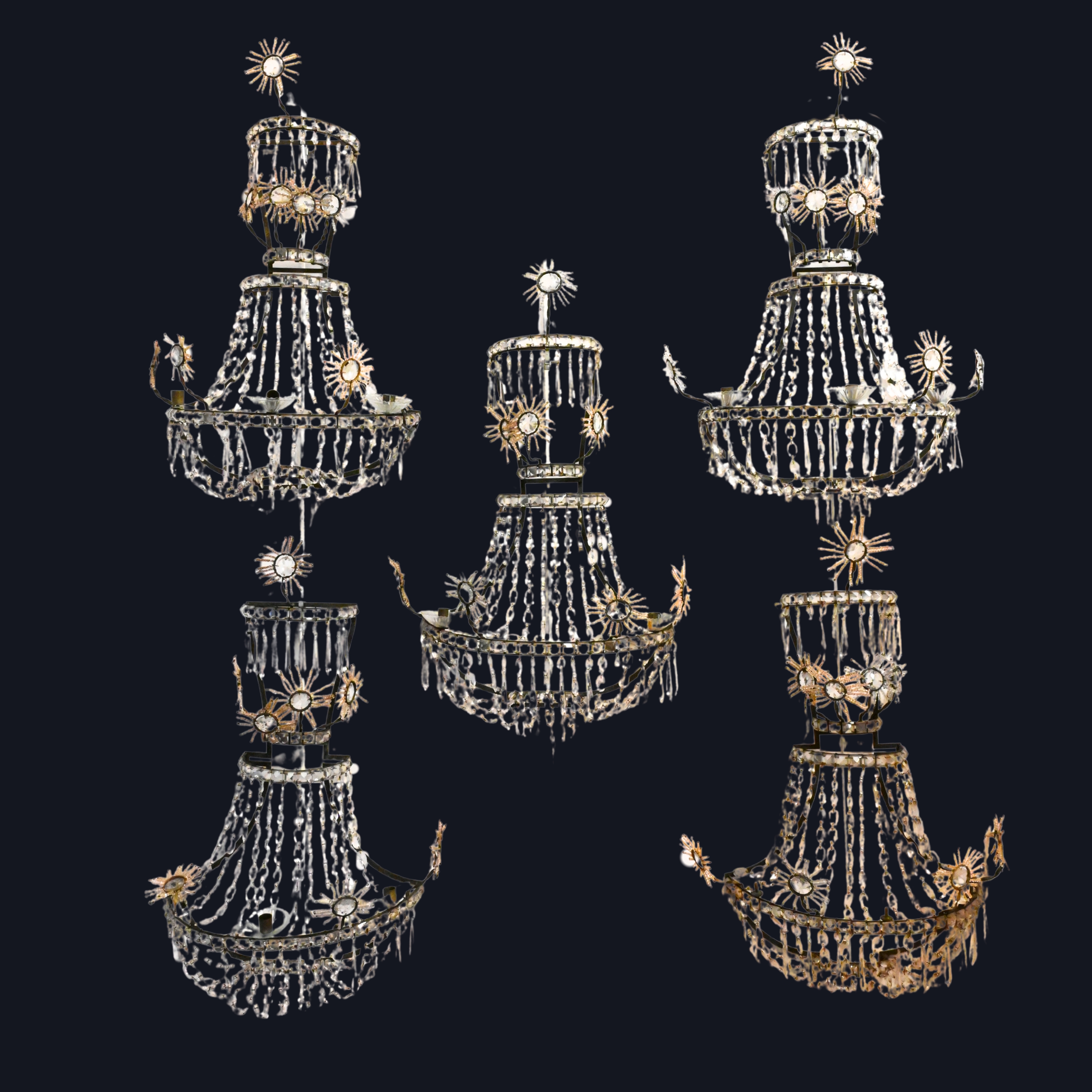 set of five basket-form wall lights, each with a metal frame hung with strings of oval and faceted cut-glass prisms, terminating in a circular lower band, upper register fitted with radiating starburst appliqués centered by cut-glass rosettes