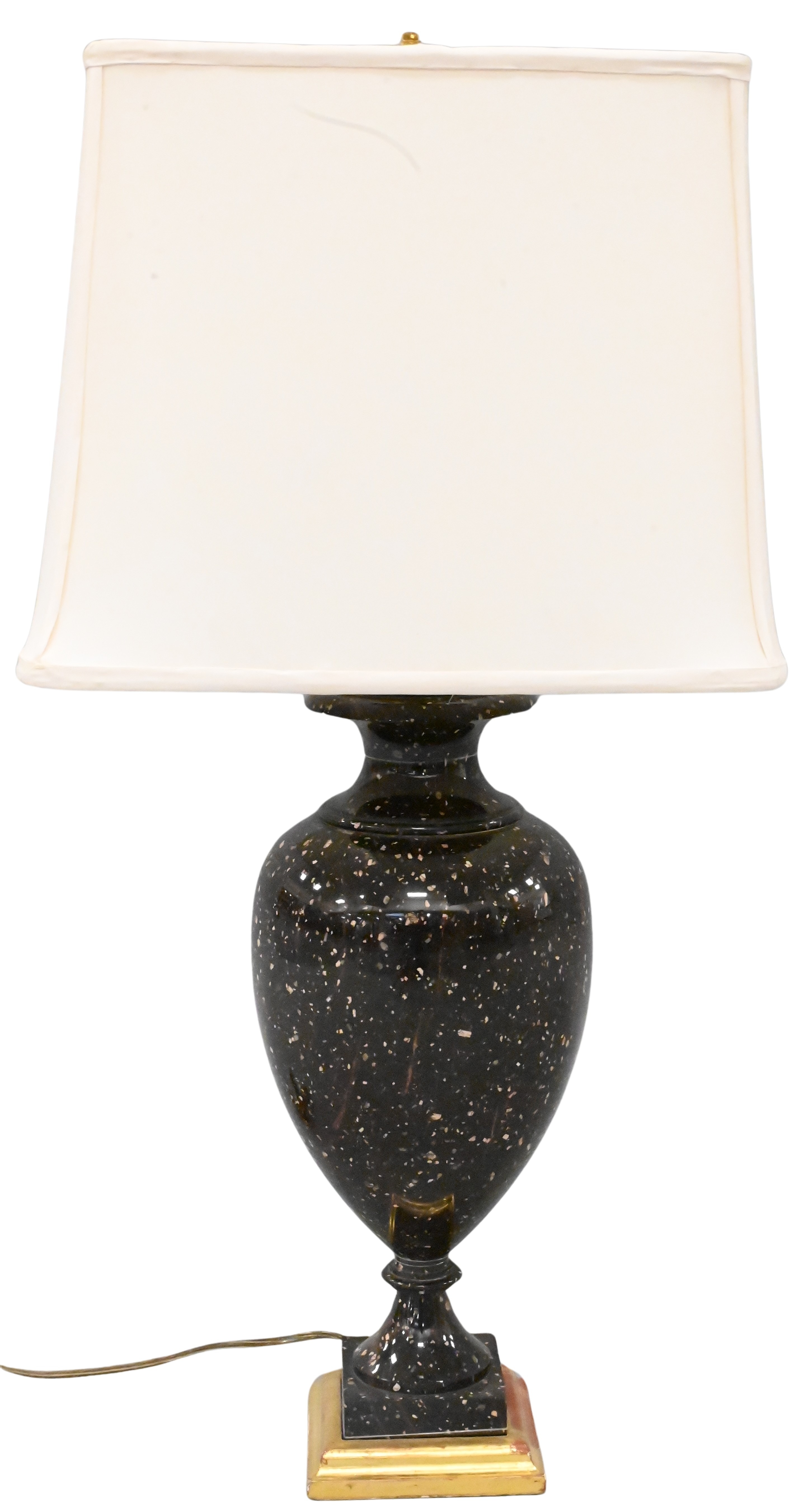 ovoid vase on a square base, finished in porphyry glaze developed at Sarreguemines during the Napoleonic period, now wired as lamp, circa 1810; the piece exemplifies the factory’s early 19th-century innovations in pulverized-stone ceramic bodies, designed to imitate costly hardstones such as porphyry, basalt, and jasper