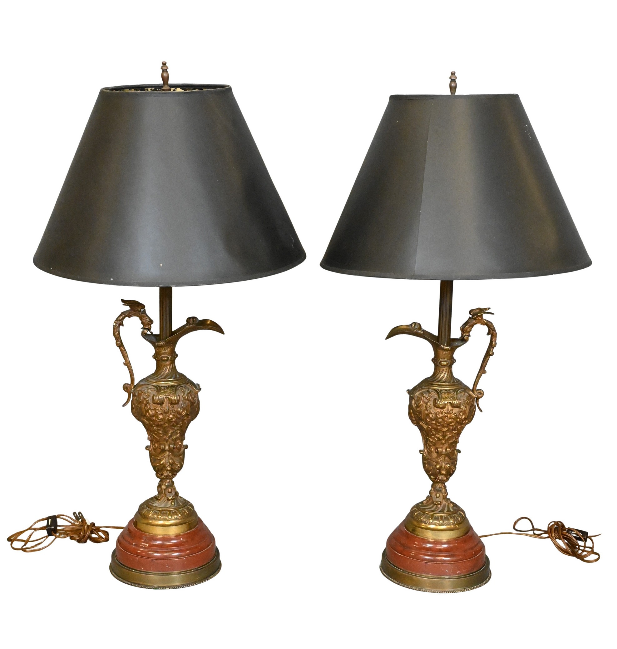 pair of French gilt-bronze mounted figural ewer-form lamps, each with scrolling acanthus and rocaille decoration, stylized dragon-form spouts, and tiered circular bases with red marble and gilt-bronze accents, later converted to electric lamps, modern shades included, late 19th century