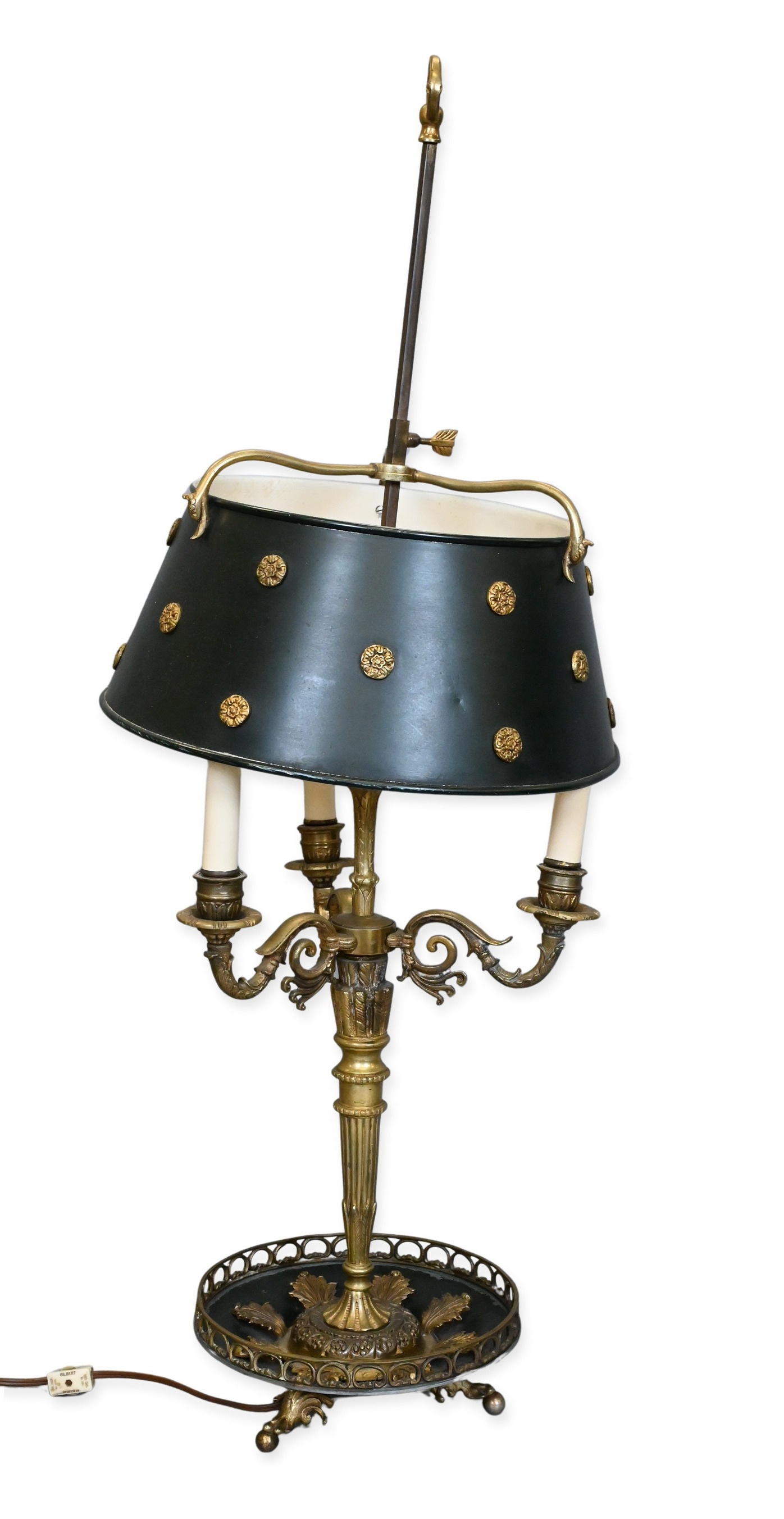 classical gilt-bronze bouillotte lamp with an adjustable green tole shade decorated with applied gilt rosettes, three-light candelabra-form standard with scrolling arms, fluted column, and foliate circular base on paw-from feet, gilt bronze and tole, electrified