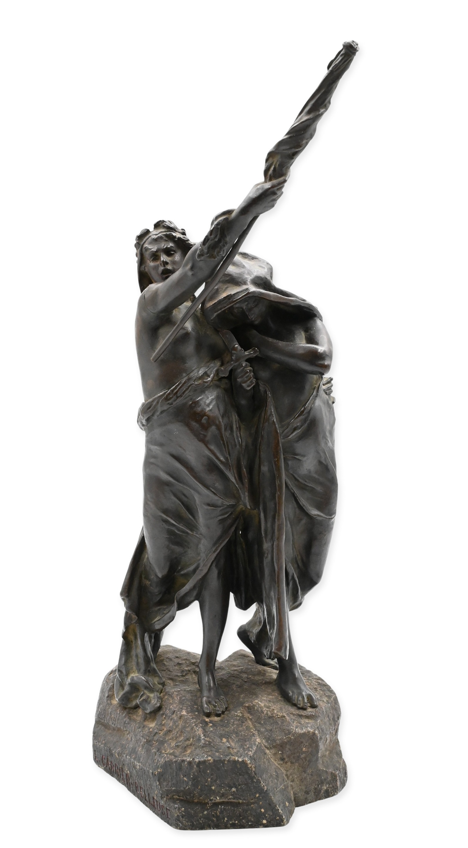 figural group depicting a heroic female standard-bearer striding forward with arm raised, sheltering beneath her sweeping cloak a second woman holding a broken sword. The dramatic composition symbolizes patriotic sacrifice, protection, and resilience, characteristic of late 19th-century French allegorical sculpture after the Franco Prussian War.