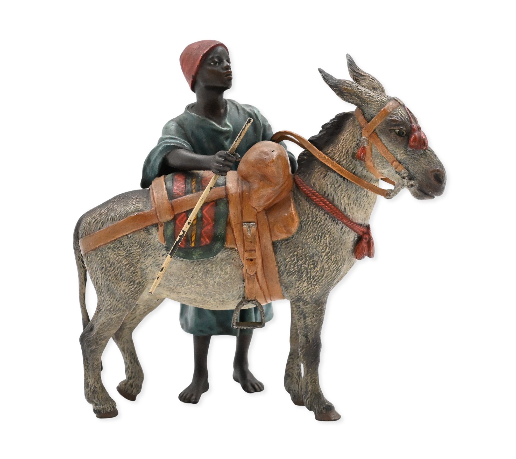 A finely cast and cold-painted bronze group depicting a young North African figure standing beside a saddled and fully harnessed donkey, the figure holding a staff and wearing a red cap and blue tunic, the donkey is modeled with detailed fur texture, blanket, packs, and bridle, all retaining the original matte cold-painted surface; number stamp beneath the donkey and additional workshop markings beneath the figure’s garment, consistent with Vienna bronze production