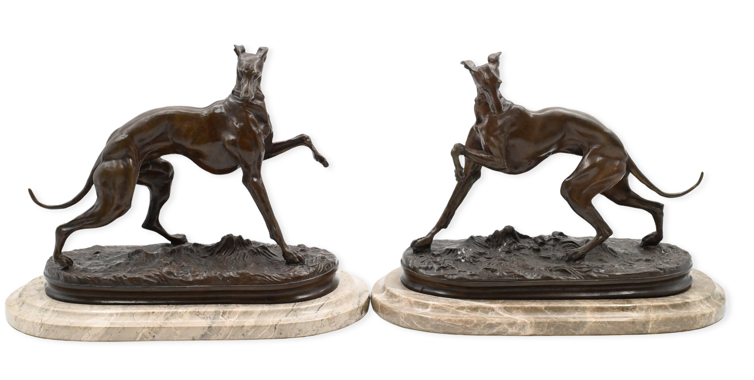 well-cast bronzes depicting two lively whippets in alert poses, each modeled with Mêne’s characteristic anatomical detail and textured ground, raised on oval integral bases