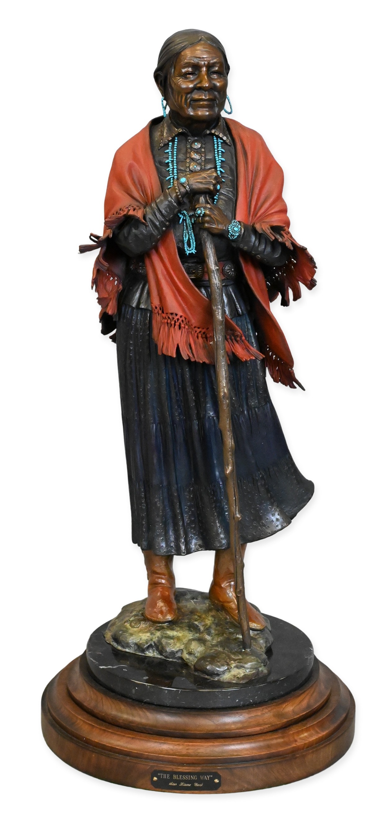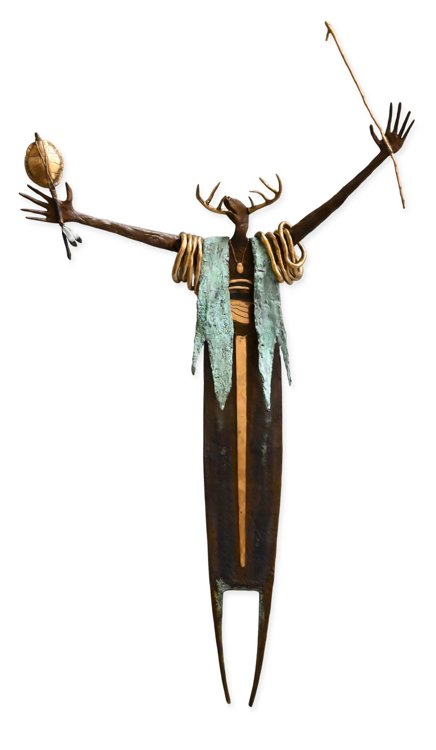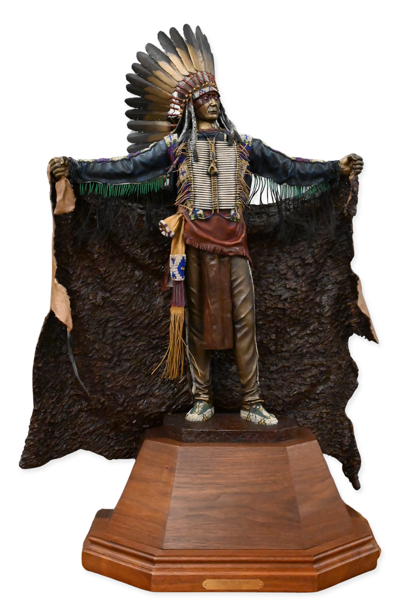 depicting the Oglala Lakota leader Touch the Clouds, son of Lone Horn, cousin and best friend of Crazy Horse the famous Oglala Sioux warrior, shown standing proudly with arms outstretched holding a buffalo hide robe. Executed with McGary’s signature hyper-realism and exceptional surface detailing. The figure features extensive cast faux beadwork, polychromed in vivid colors along the headdress, armbands, shoulder panels, pouch, and moccasins, together with modeled leather fringe, a full bone breastplate, and deeply textured garments.