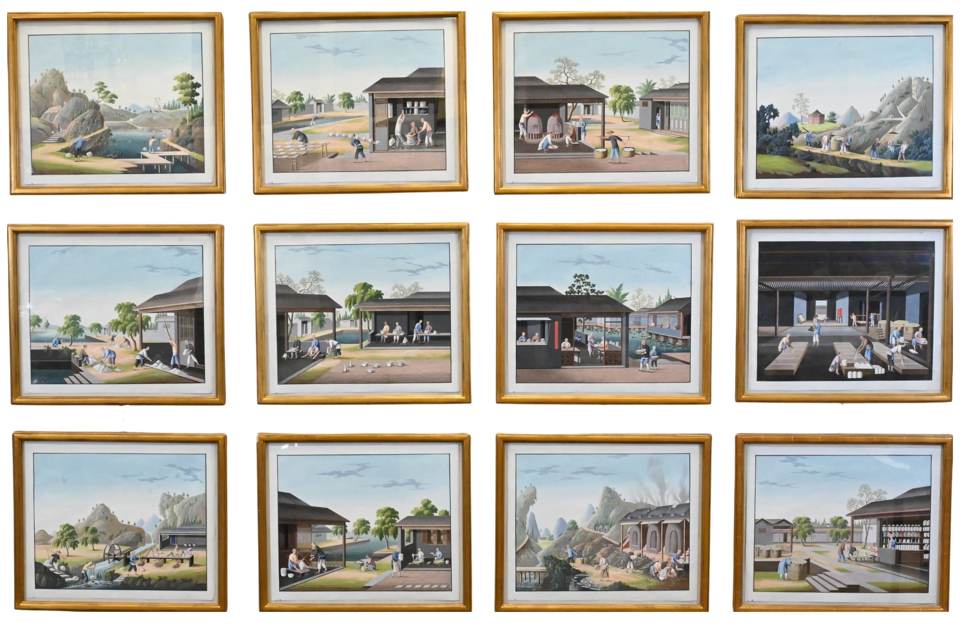 Set of Twelve Export Trade Pictures Depicting the Manufacture and Distribution of Porcelain