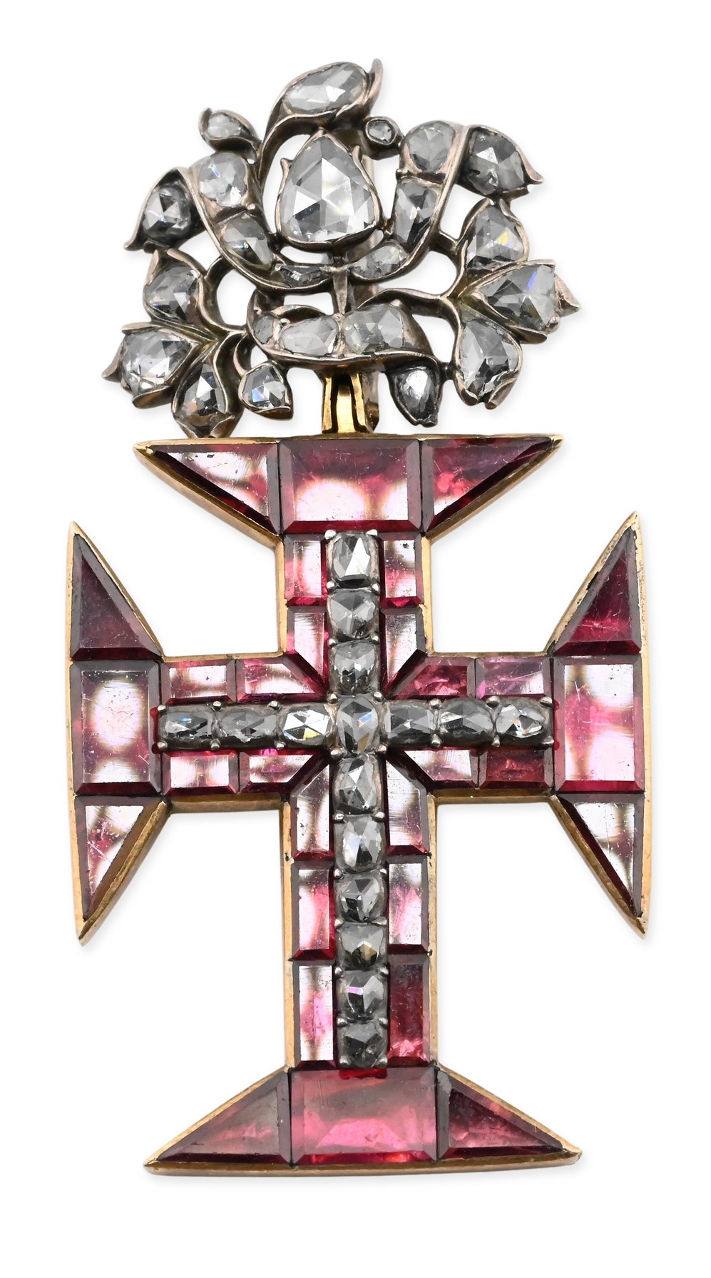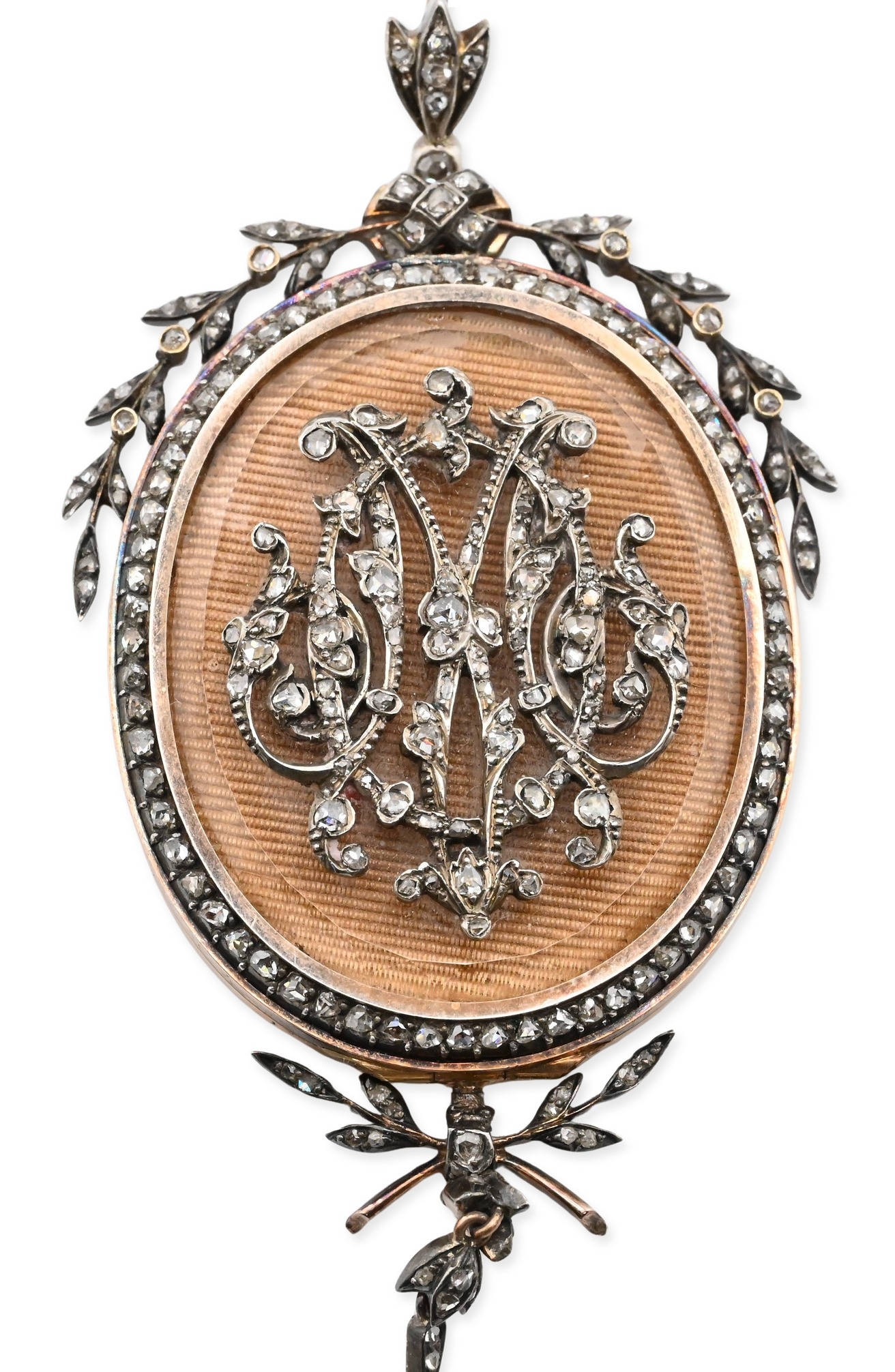 designed as a large bouquet with scrolling foliate stems, enameled leaves in translucent green, and floral clusters set throughout with numerous old mine-cut and rose-cut diamonds, the brooch centers several larger old mine-cut diamonds, mounted in the center of the principal blossoms, surrounded by smaller rose-cut stones in prong and bead settings, together forming radiating floral clusters, additional blossoms and buds are set with rose-cut diamonds, with further accents on the bow-form ribbon at the top of the spray, the reverse fitted with a hinged pin stem and secure clasp, 18th to 19th century