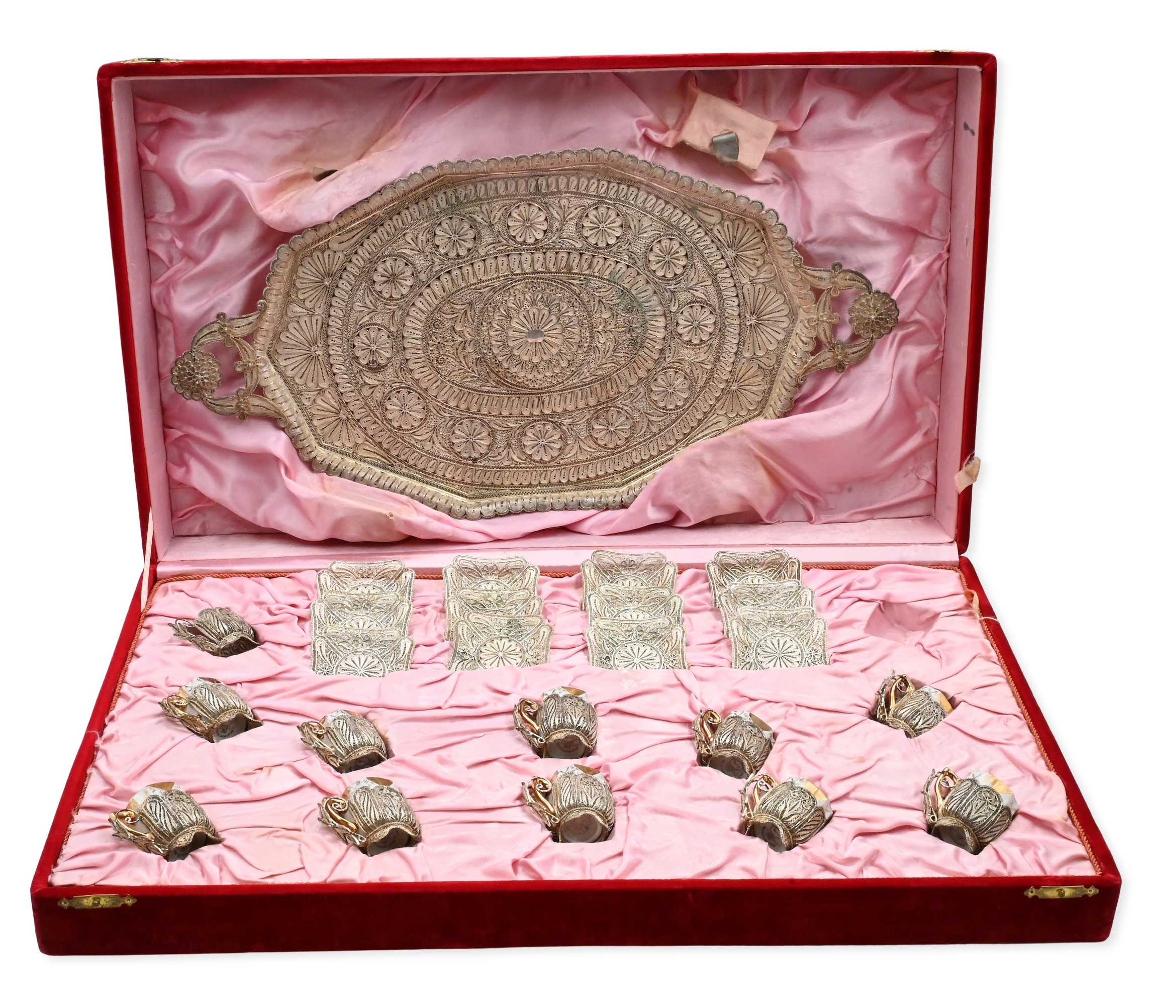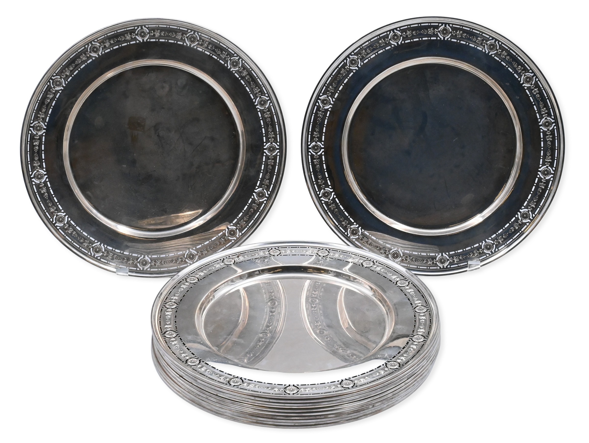 to include 12 dinner forks, 12 luncheon forks, 12 salad, 12 fish forks, 12 cocktail forks, 12 dessert forks, 12 ice cream forks/spoons, 6 place spoons, 12 tablespoons, 12 soup spoons, 12 bouillon spoons, 24 teaspoons, 12 ice tea spoons, 12 demi spoons, 12 sherbet spoons, 12 dinner knives, 12 luncheon knives, 12, weighted butter knives, 12 solid butter knives (7 inches), 12 solid butter knives (5 3/4 inches), 16 serving pieces, 2 pie servers, 1 knife sharpener, 2 carving forks, and 2 carving knives, to include custom wooden fitted box