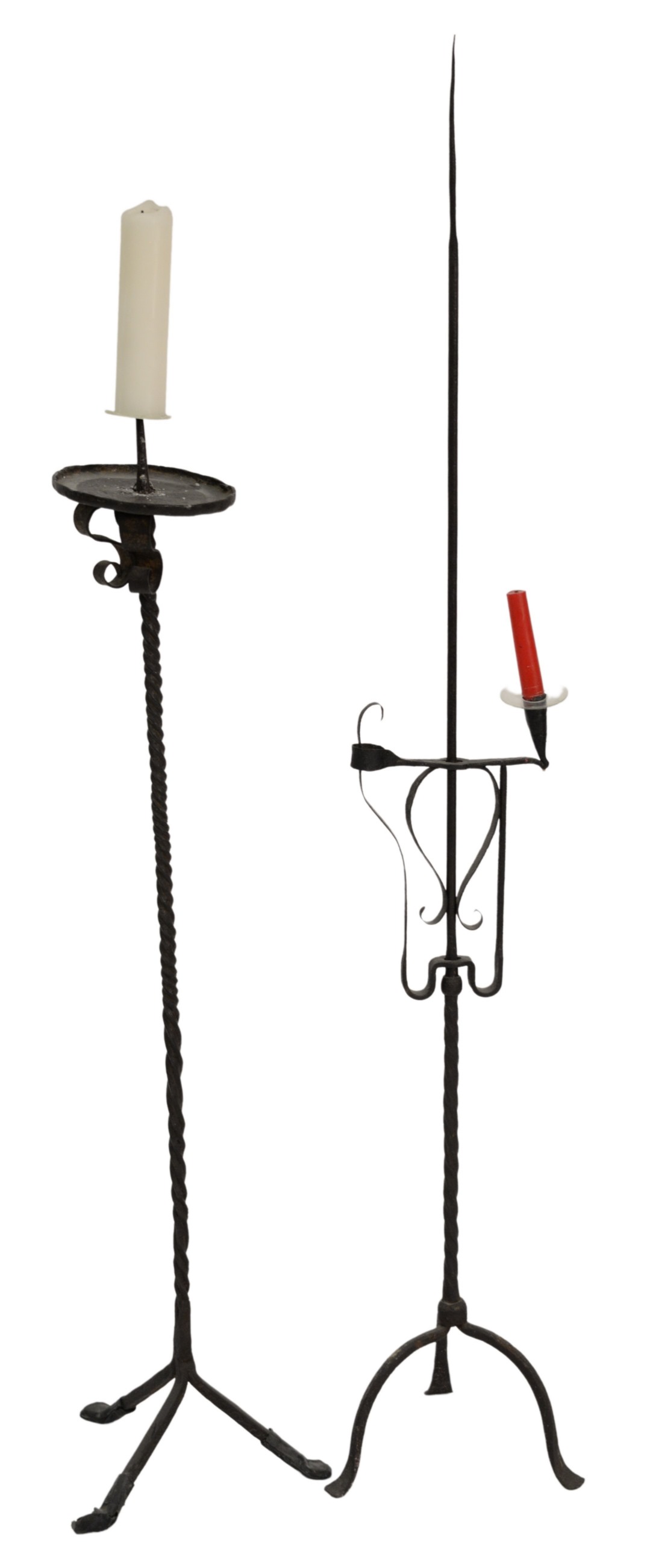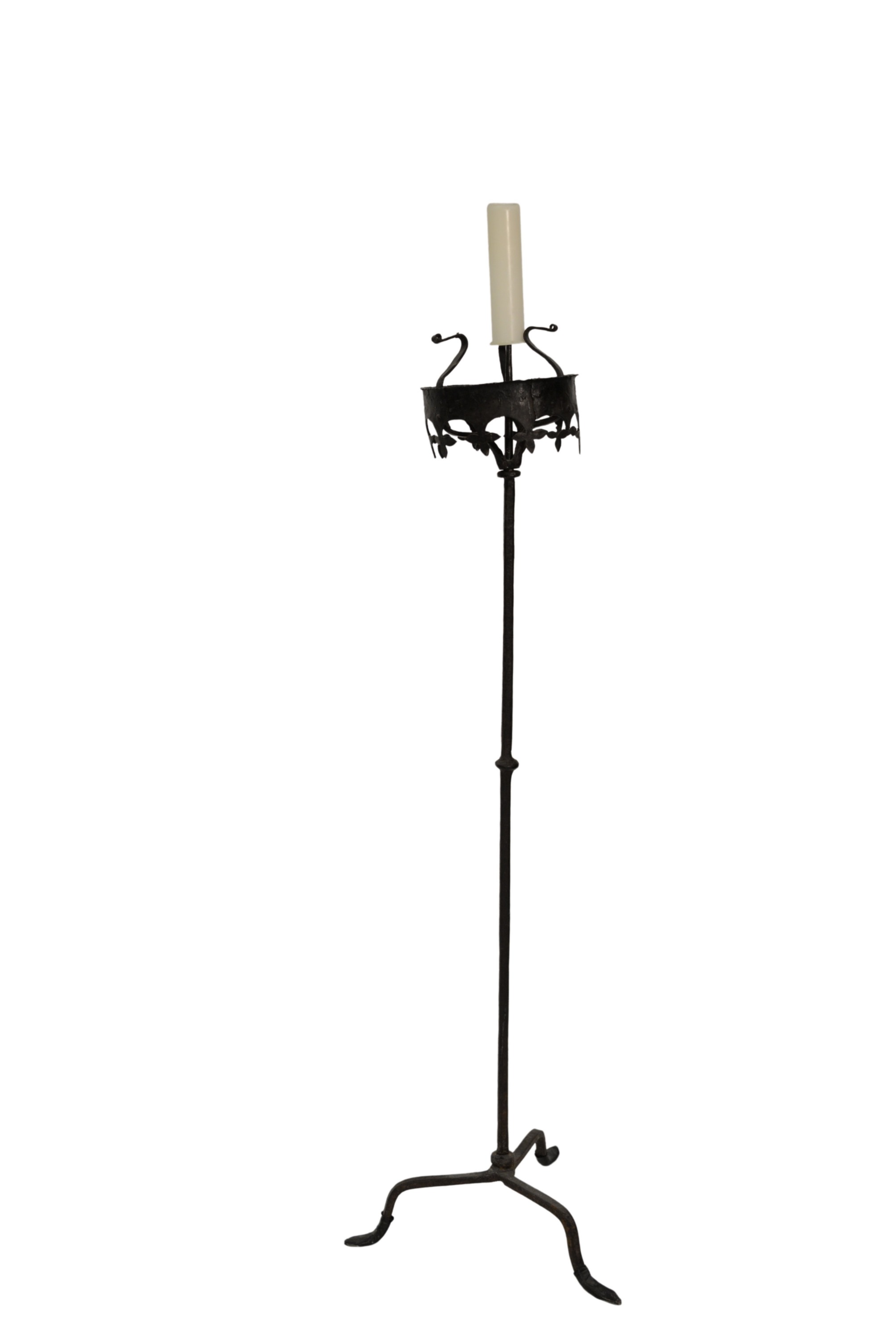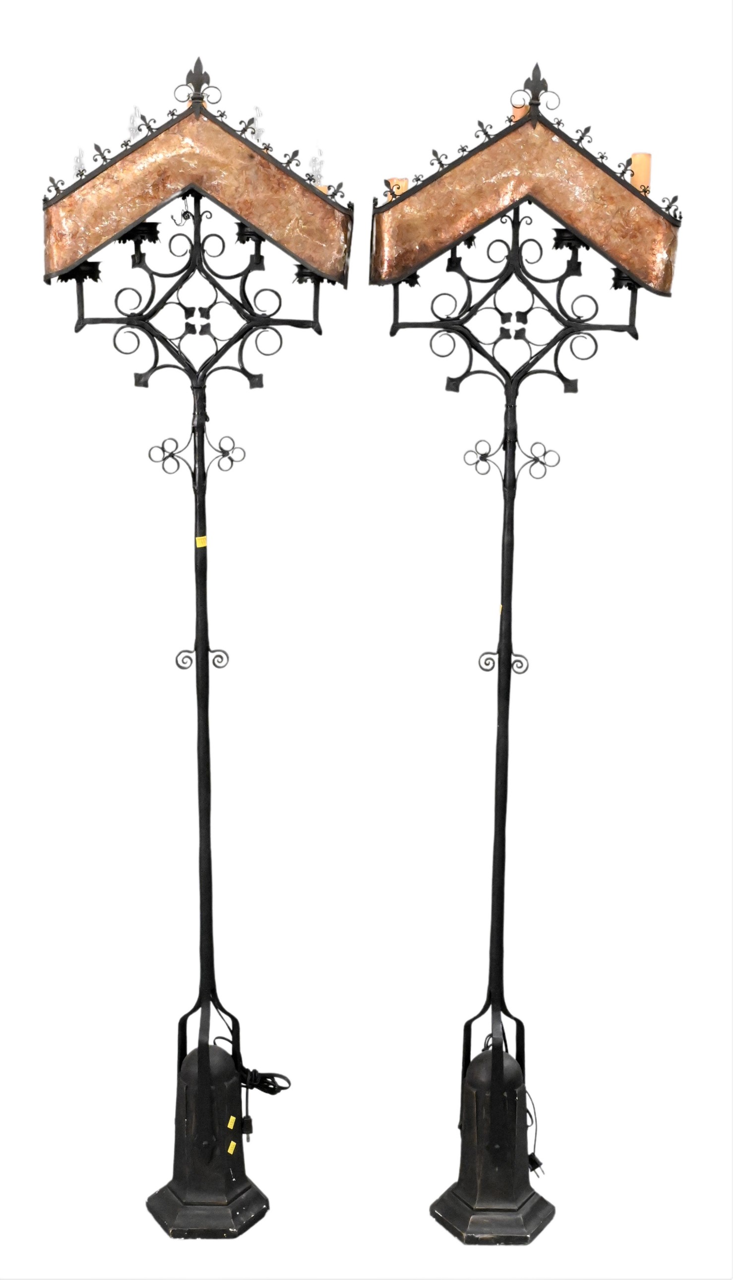A Pair of Large Gothic Arts & Crafts Floor Lamps, each having five lights with a large one piece mica shade, possibly Samuel Yellin (1884 – 1940), heights 78 inches.