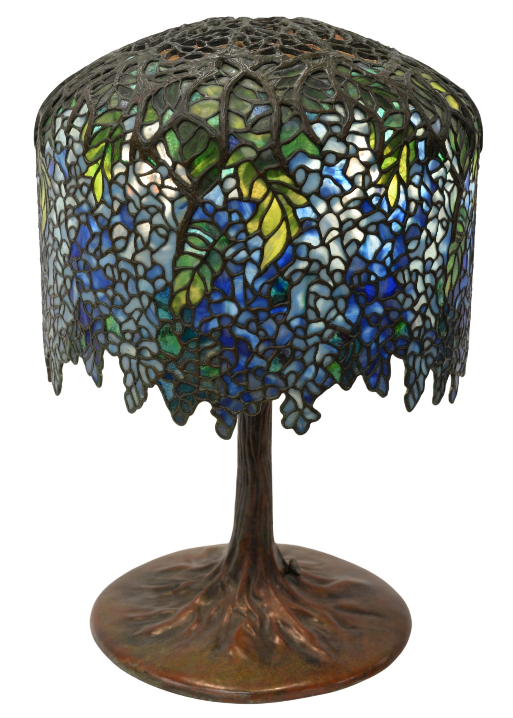 Paul Crist Studios, Tiffany style leaded glass wisteria table lamp, on tree form base, rich and brilliant violet cobalt blue hues with opalescent lavender and sky blue mottles, marked Tiffany & Co on bottom, height 26 inches, shade diameter 17 3/4 inches.