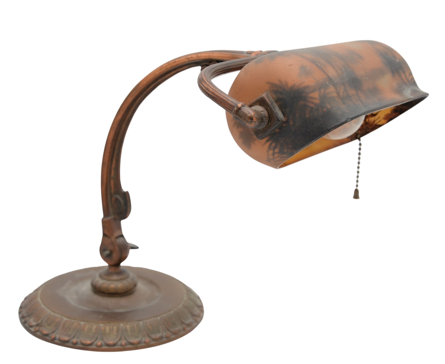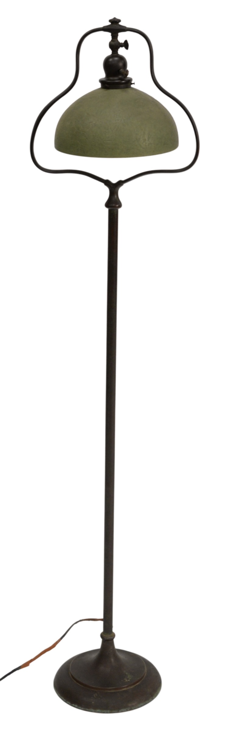 Handel Floor Lamp, having bell type green shade (repaired), shade signed Mosserine 6068, height 10 1/2 inches, shade height 5 1/4 inches.