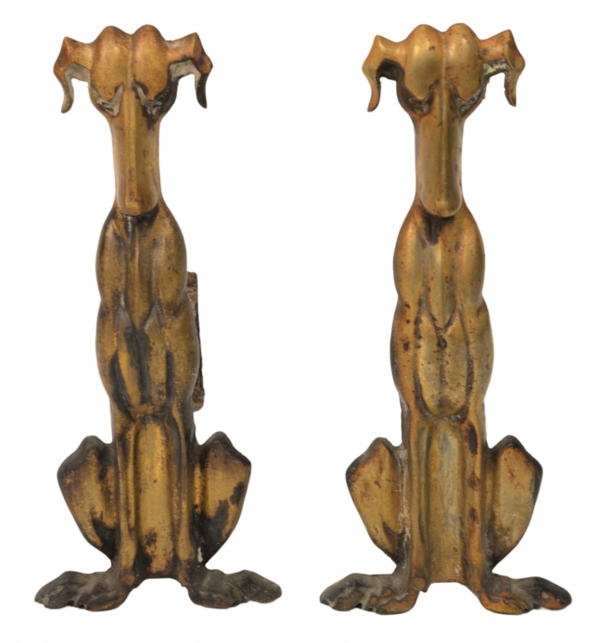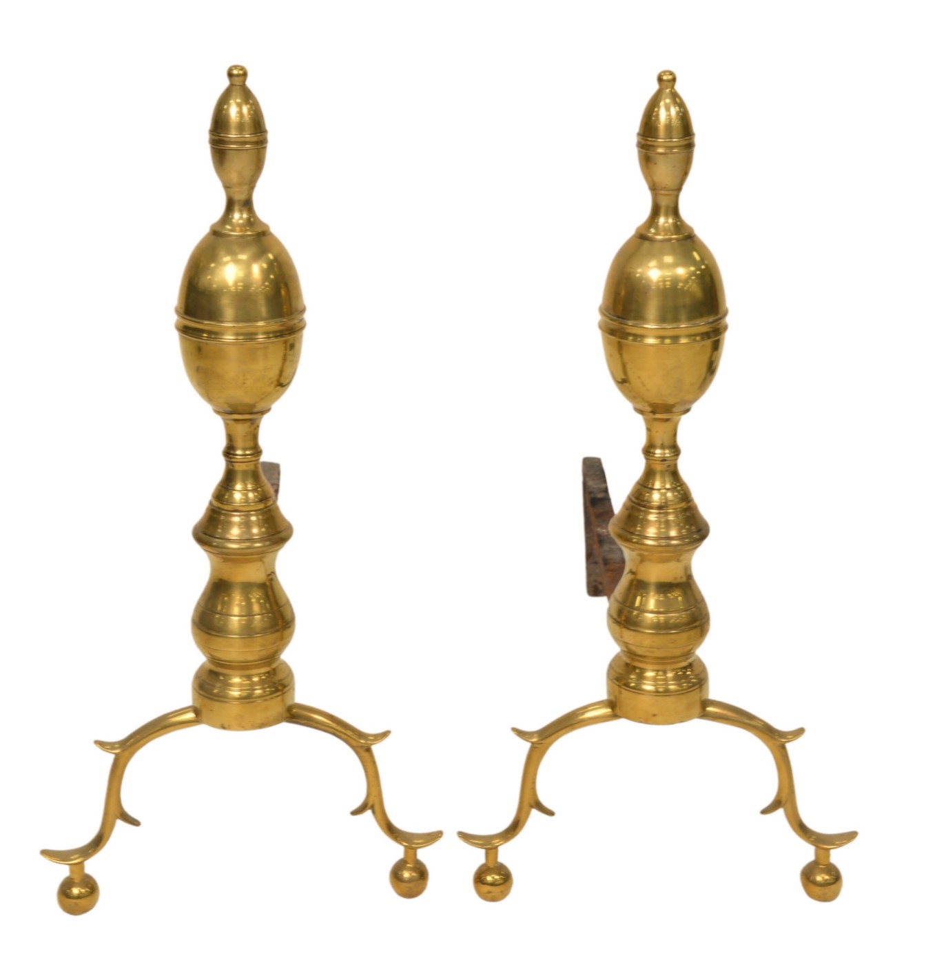 A Pair of Federal Brass Double Lemon Top Andirons, circa 1830, height 22 inches, length 22 inches.