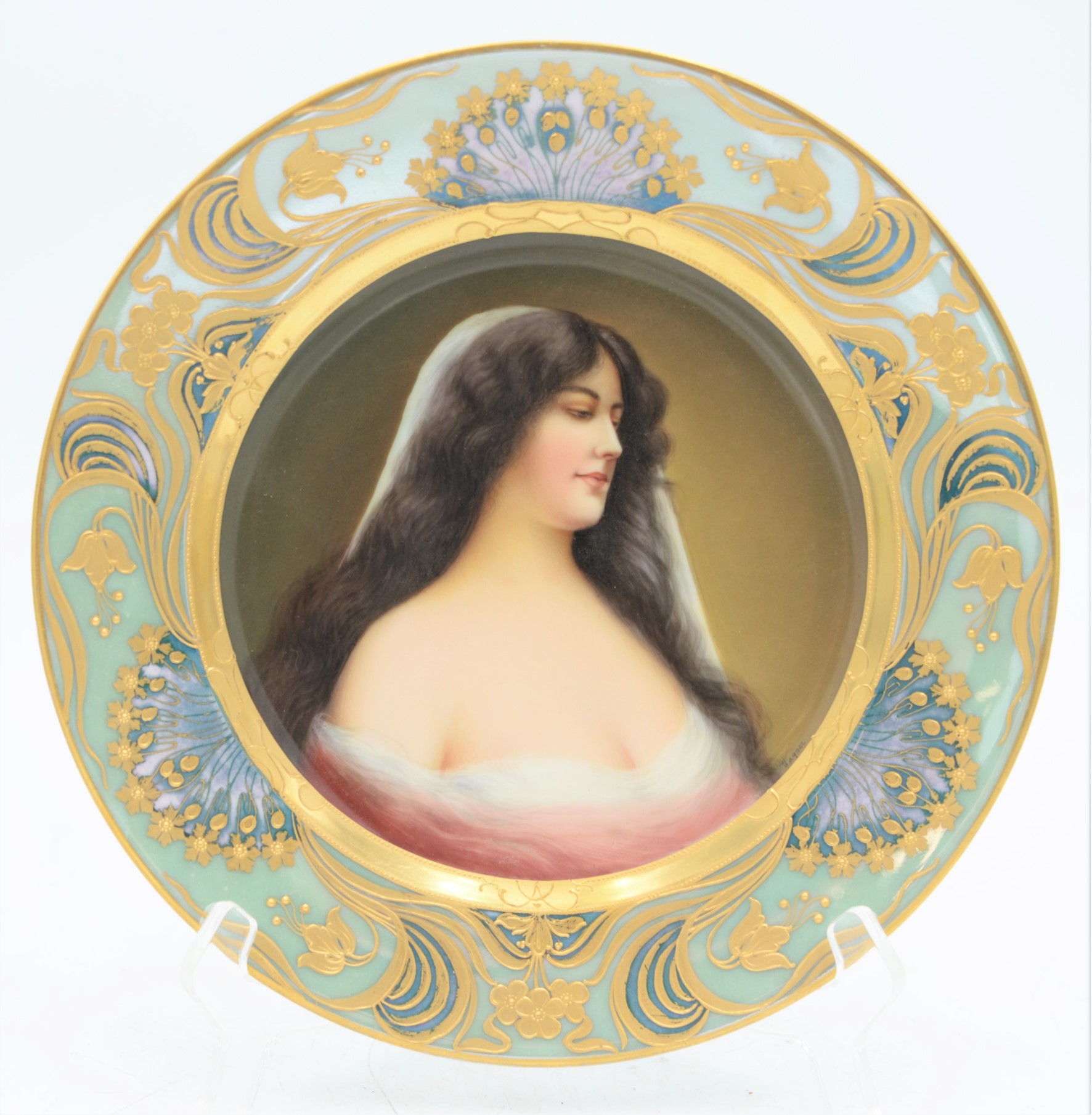 Wagner Royal Vienna Portrait Plate, young veiled woman, with high relief border, signed “Wagner” lower right, stamped with Royal Vienna beehive on reverse, diameter 9 3/4 inches.