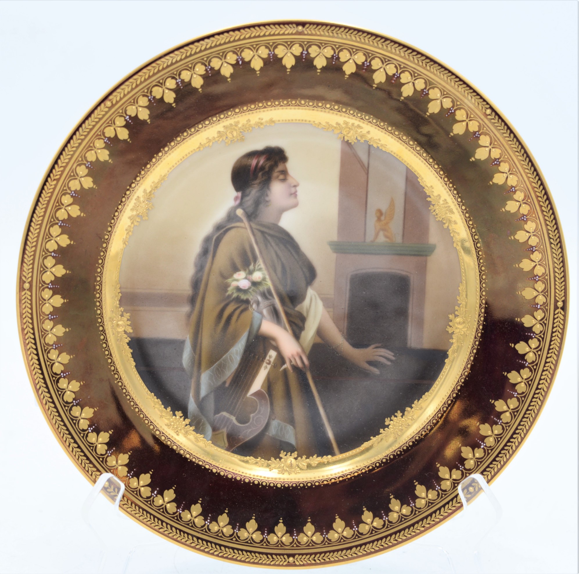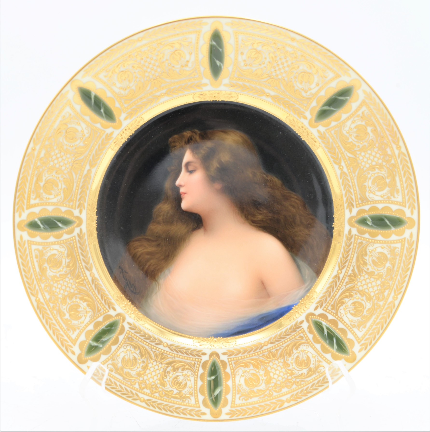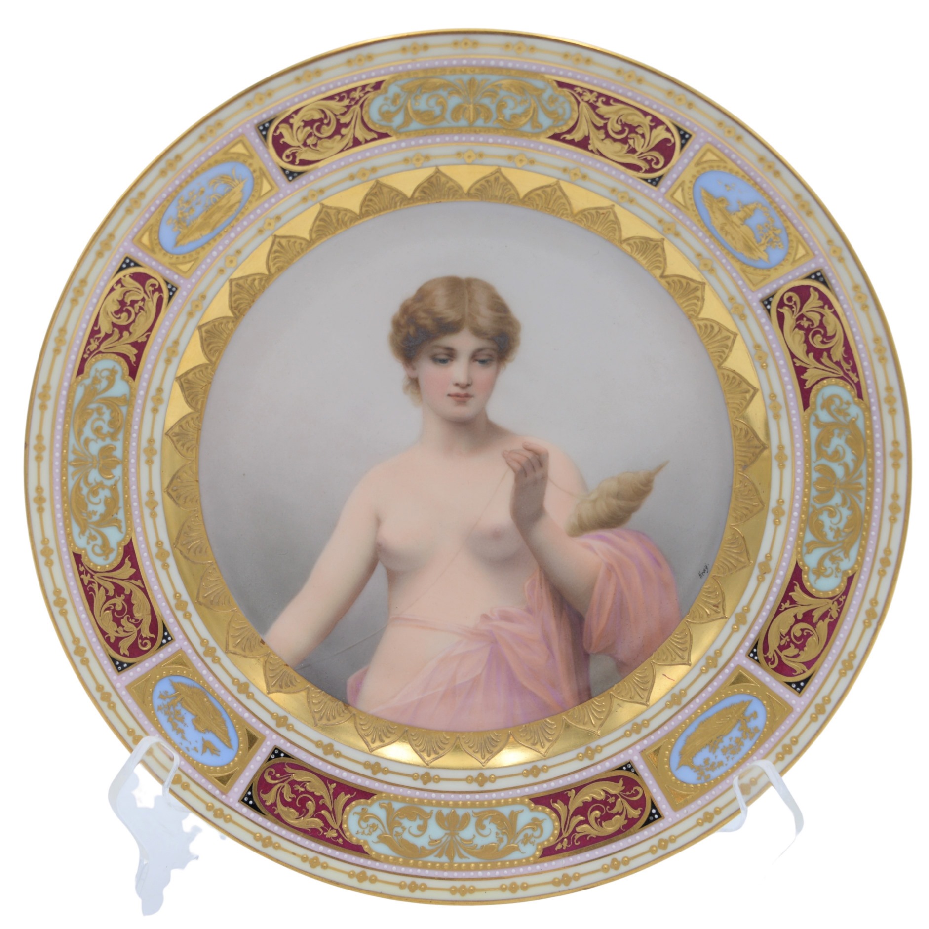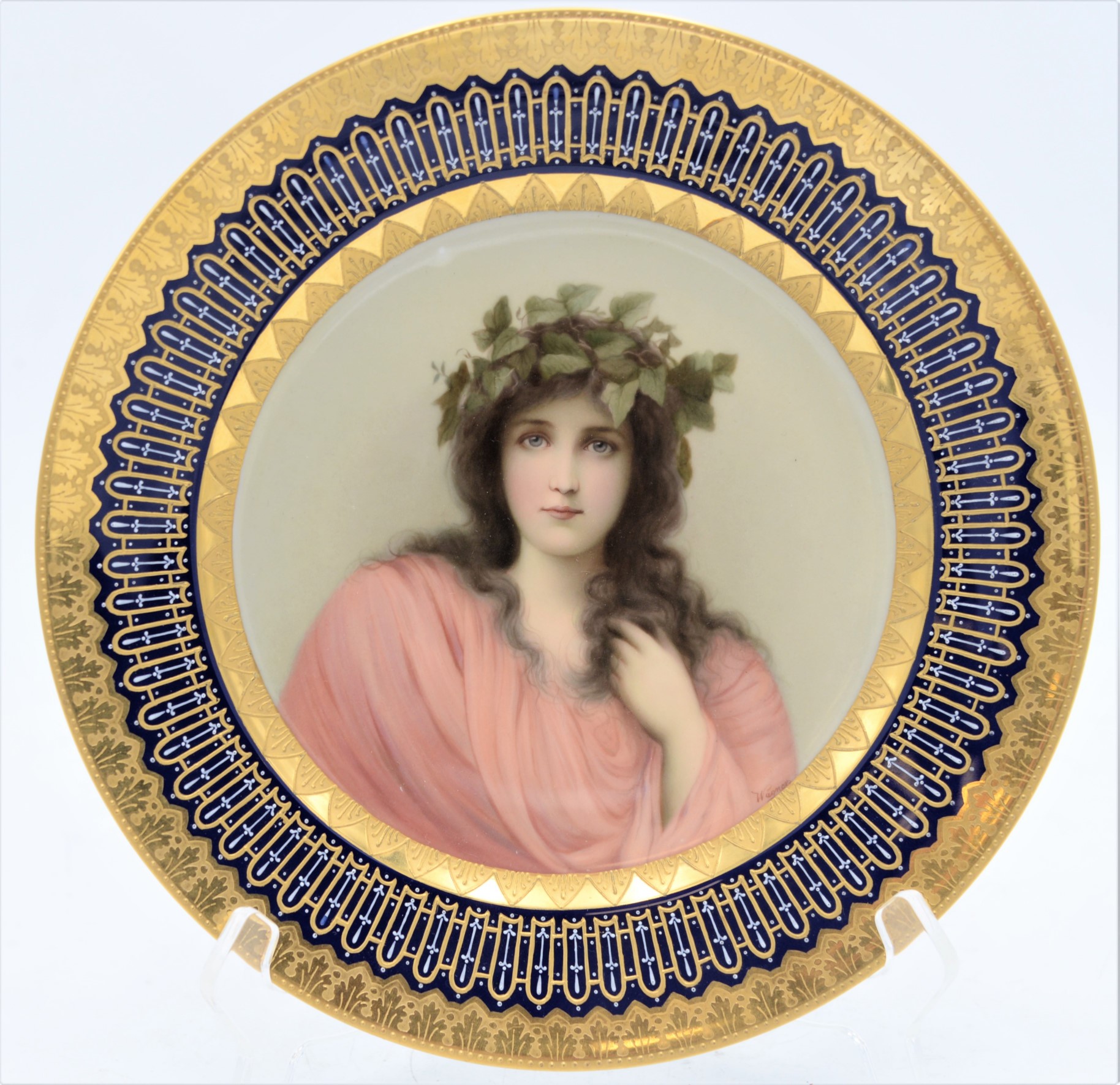 Wagner Royal Vienna Portrait Plate, “Fruhling”, partially clad young woman, signed “Wagner” lower right and stamped with Royal Vienna beehive on reverse, diameter 9 3/4 inches.