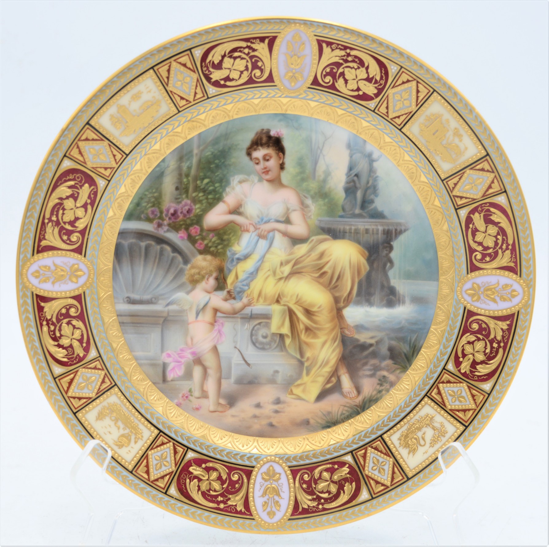 Wagner Royal Vienna Portrait Plate, handpainted, “Solitude”, partially clad woman, with high relief and orange jeweled borders, signed “Wagner”, diameter 9 1/2 inches.