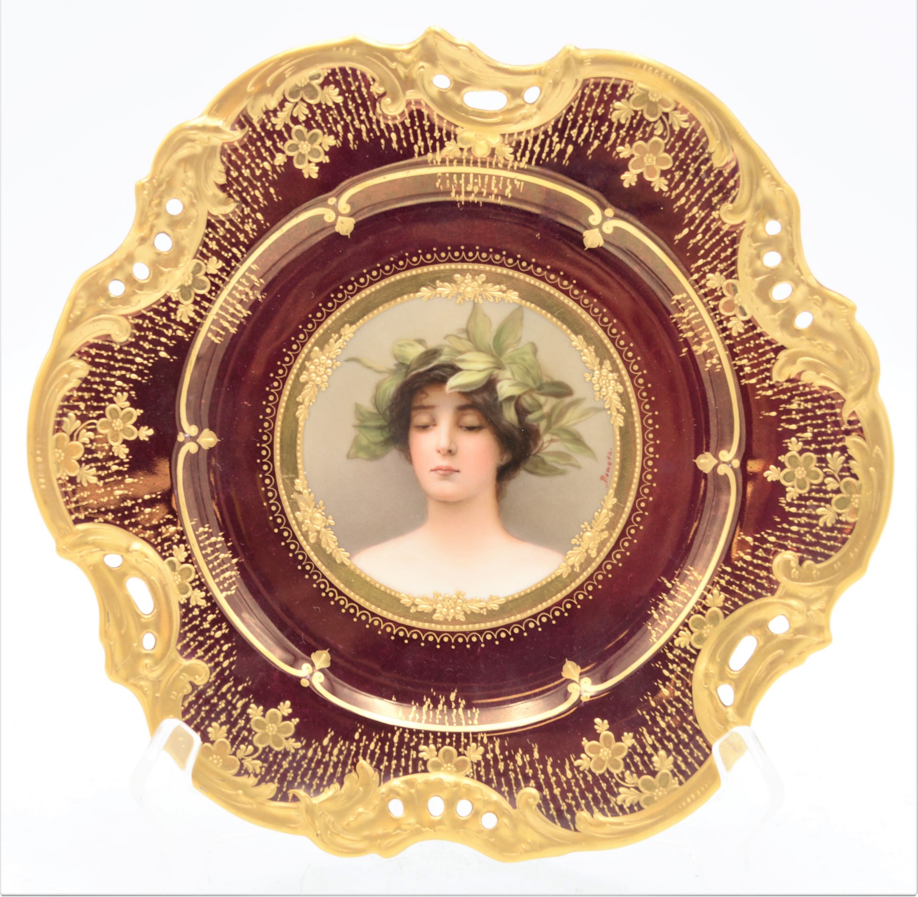 Royal Vienna Portrait Plate, “Daphne”, with high relief reticulated border, signed “Donath” on the right, stamped with Royal Vienna beehive on reverse, along with “Germany” and copyrighted “Gesetzlich Geschutzt”, featuring the mythological nymph Daphne with a laurel wreath crown, diameter 9 inches.