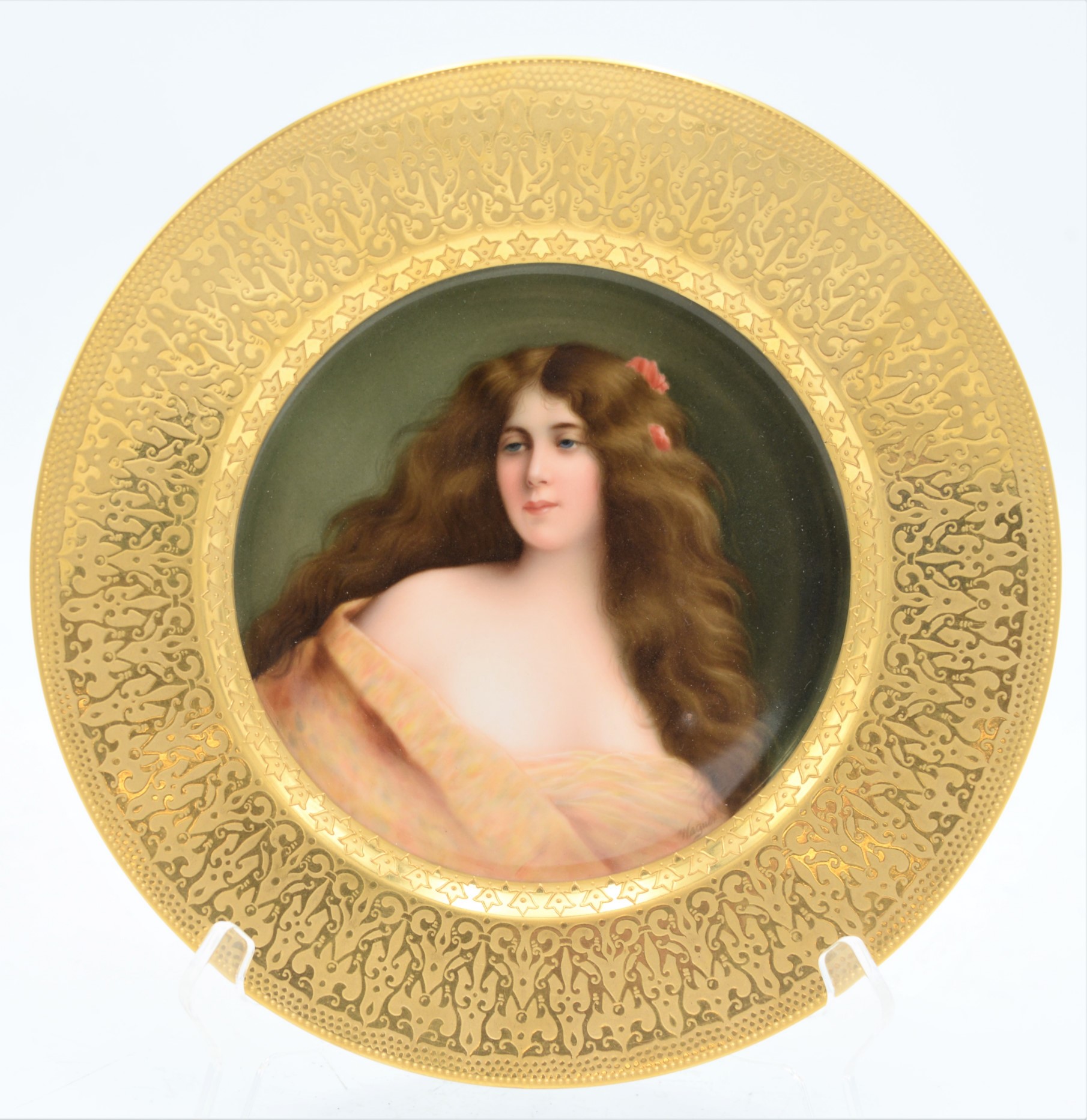 Royal Vienna Portrait Plate, having partially clad woman, high relief border, artist signed “Schultz” lower right, stamped with Royal Vienna beehive on reverse, diameter 10 1/2 inches.