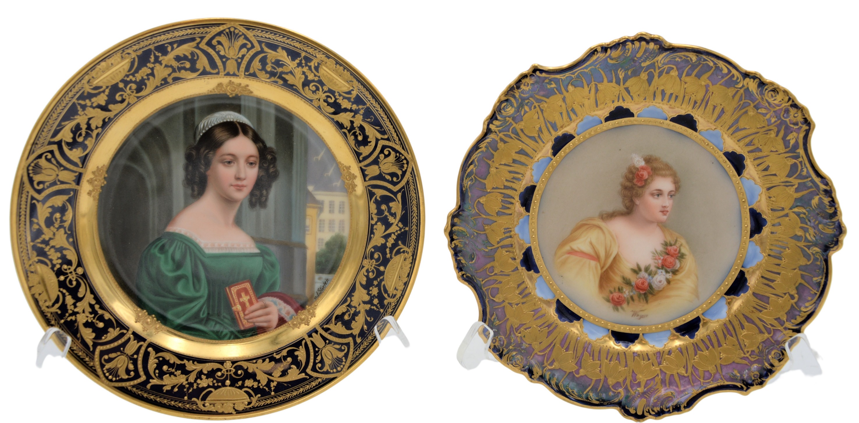 Two Royal Vienna Portrait Plates, to include “Delina” with high relief border, signed “Fritsch” lower right, stamped Royal Vienna, beehive on reverse, featuring a young blond woman with long flowing hair in an orange shawl, artist signed; along with a hand painted plate of a woman with cherub; diameter 9 inches; diameter 9 1/2 inches.