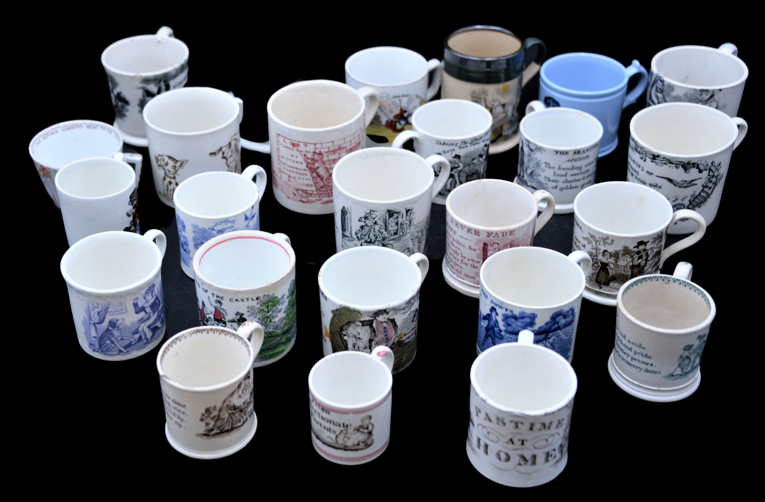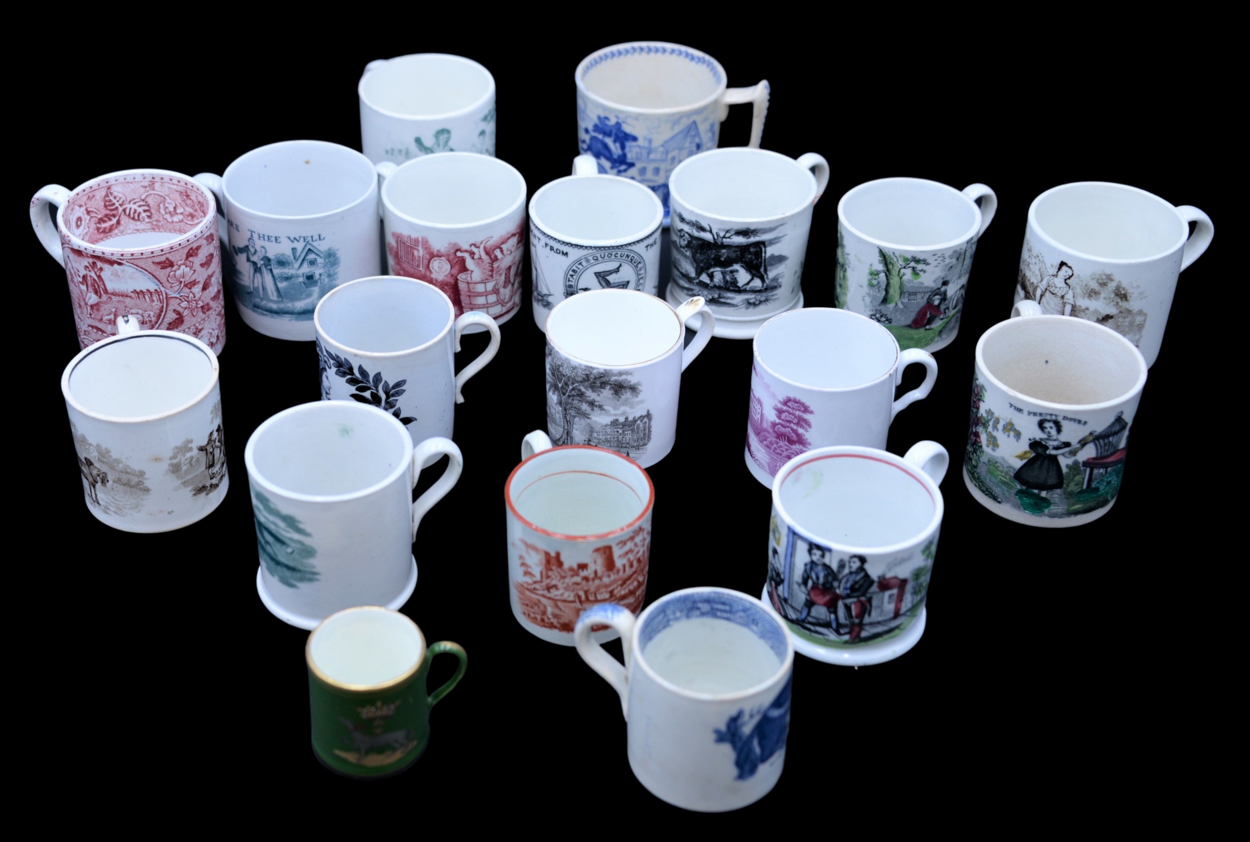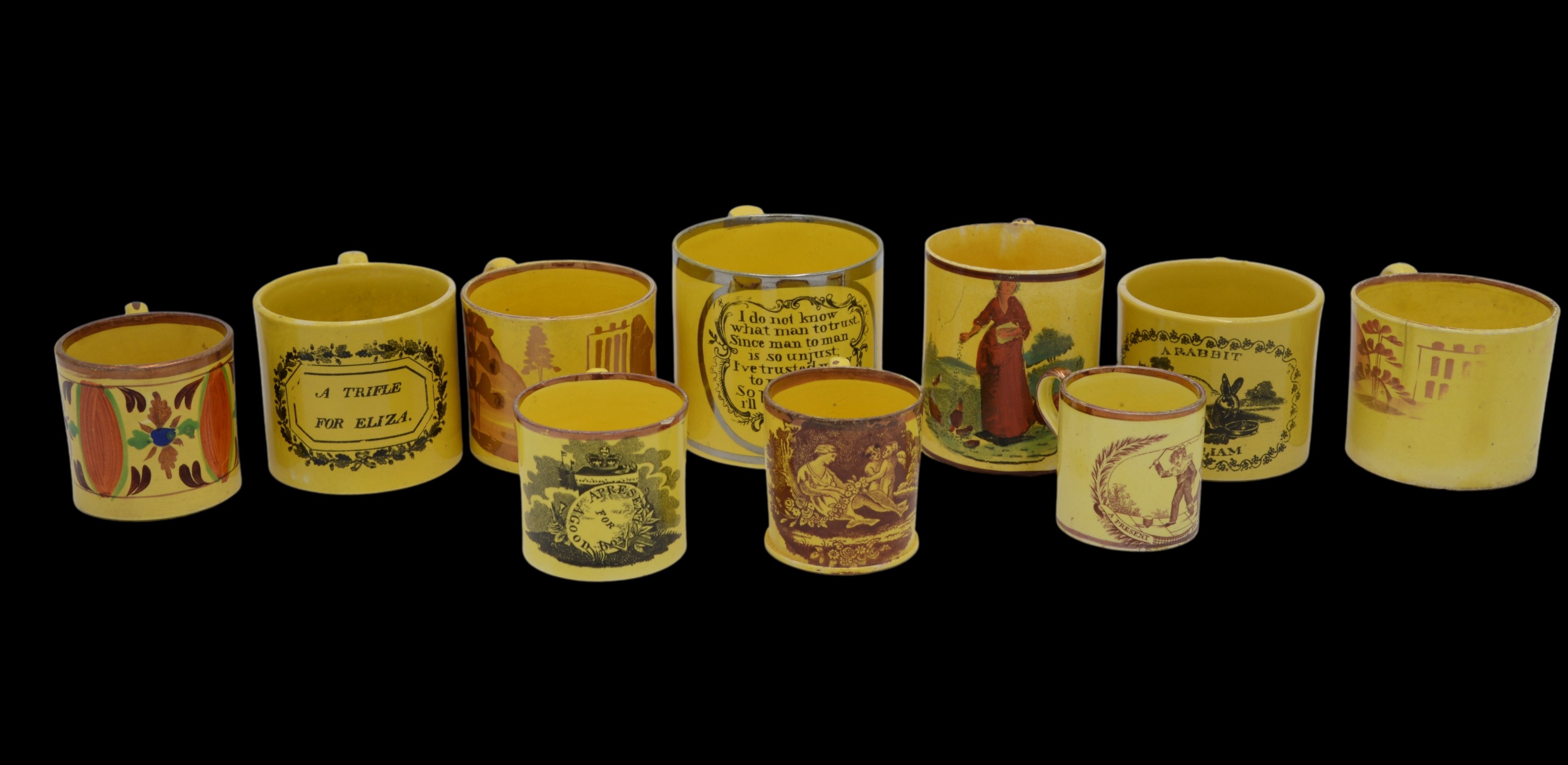 Group of 10 Canary Yellow Childrens’ Mugs, to include a 19th century porcelain Staffordshire, having silver luster, inscribed “I do not know what man to trust…”, height 3 inches. Provenance: Sotheby’s New York, Sale 1347, Lot 241, 1/29/91; “A Present Dear Boy”. Provenances: Sotheby’s New York, Sale 1347, Lot 241, 1/19/91; one mug printed in iron-red with a maiden holding a garland and reclining at the base of a tree by two cupids beneath the inscription “AP…R Girl”, pink luster band at rim, height 2 inches, Sotheby’s New York, Sale 4663YA, Lot 69, 7/9/81; one having having scene painted in shades of metallic brown, height 2 3/8 inches, Christie’s New york, Sale 6945, Lot 1208/8, 1/16/90; one with scene painted in shades of metallic brown, height 2 3/8 inches. , Christie’s New York, Sale 6945, Lot 120/8, 1/16/90; one mug marked “A Trifle for Eliza”, height 2 1/2 inches, Christie’s New York, Sale 5095, Lot 196, 10/8/83; one painted in iron-red, green and blue enamel and pink luster with a wide border of stylized foliage and flowerheads between pink luster bands, height 2 1/4 inches, restoration: handle repaired, Sotheby’s New York, Sale H-4, Lot 47, 7/15/82; one printed in black with an oval inscribed “A Present for a Good Boy”, height 2 inches, Sotheby’s New York, sale 4663YA, lot 69, 7/9/81; one printed in black with a rabbit ” A Rabbit for William”, height 2 1/2 inches, Sotheby’s New York, Sale 5095, Lot 193, 10/1/83; one painted in iron-red, green and brown with a woman feeding chickens, height 3 inches, Sotheby’s New York, Sale H-4, Lot 47, 7/16/82.