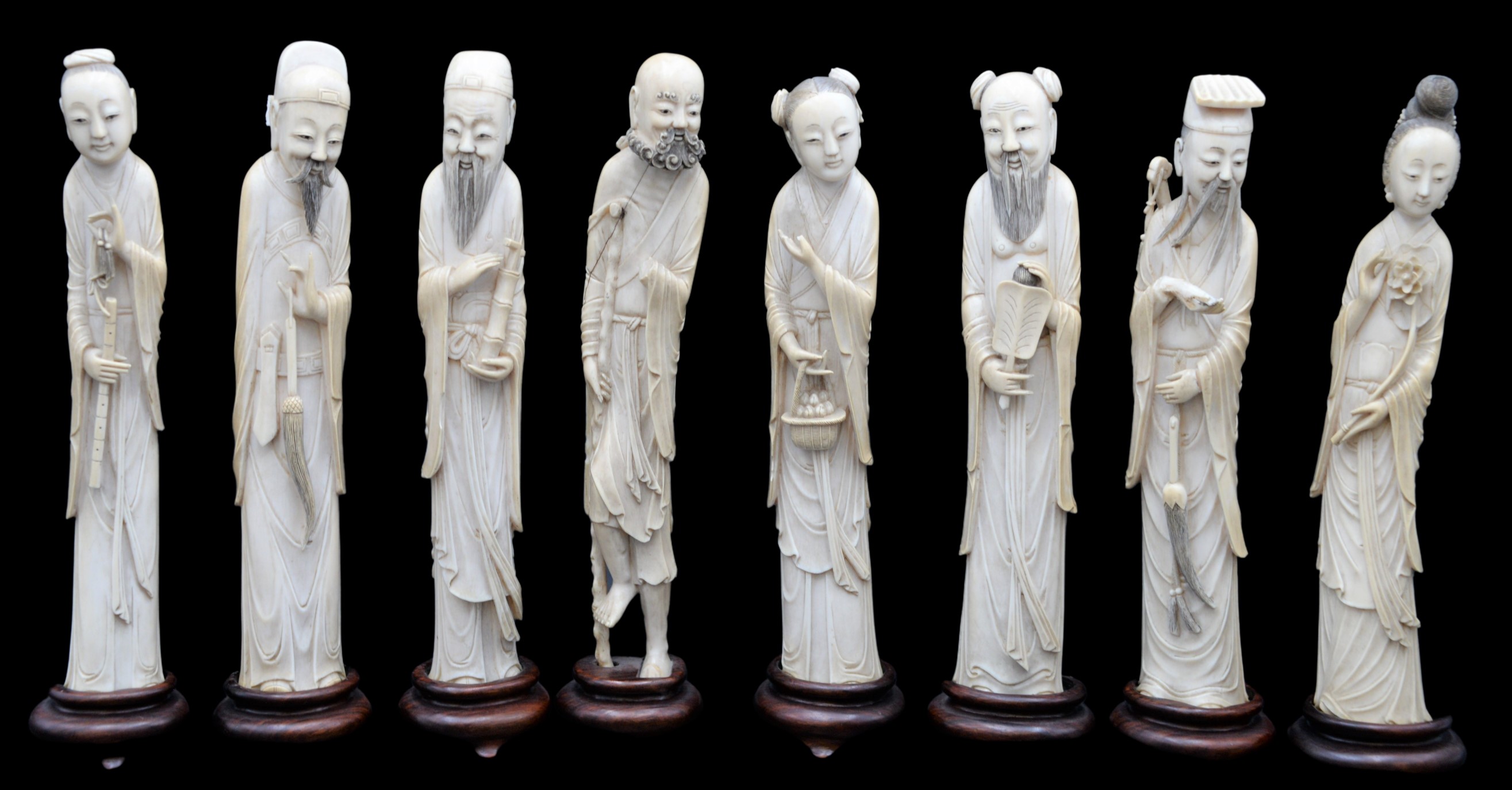 Chinese Set of The Eight Immortals, China, 19th century, carved standing figures, heights 8 1/4 – 8 1/2 inches.
