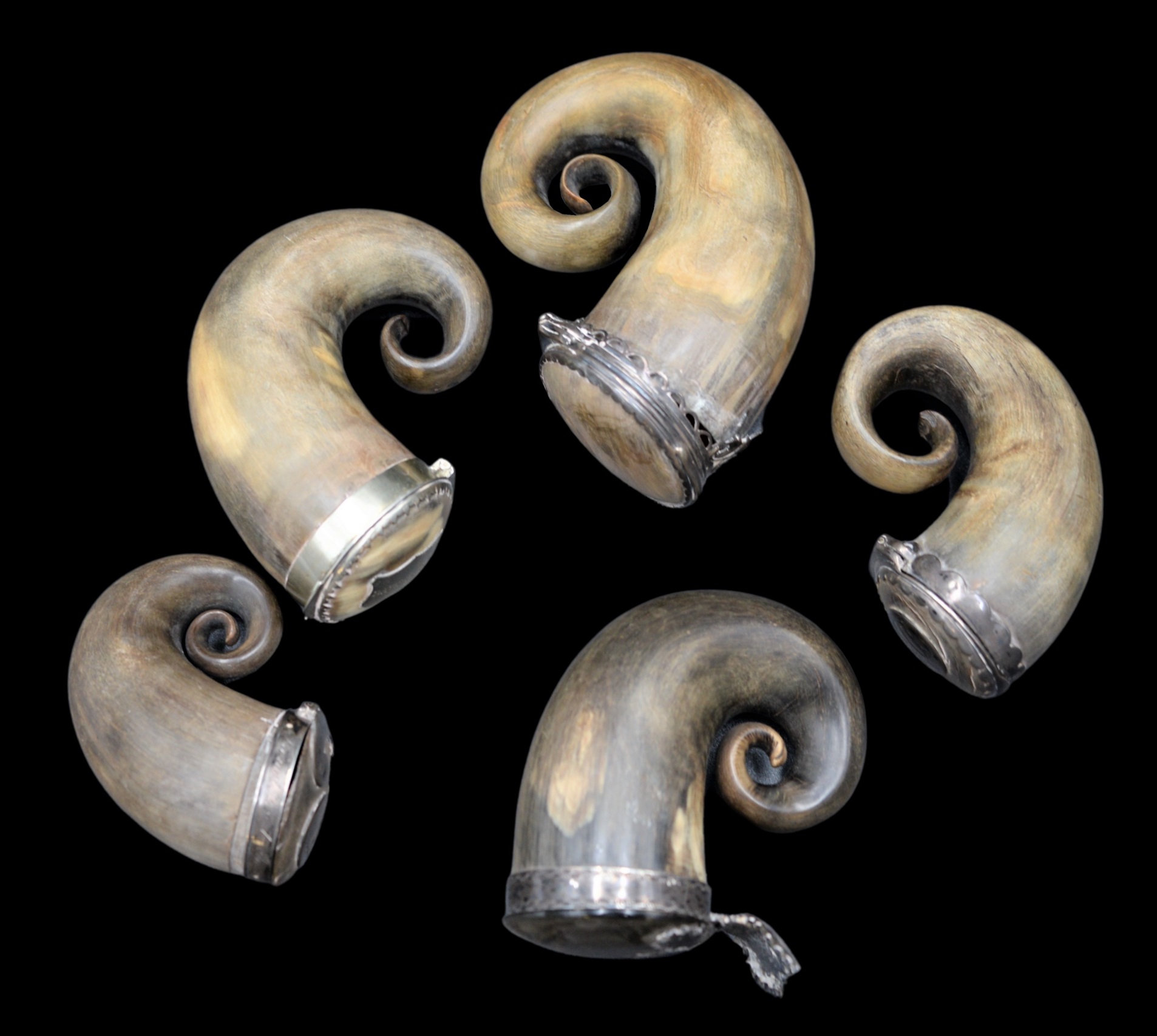 Group of Five Rams Horn Snuff Mulls, each in presentation box having silver mounted lids, one initialed “A.T” for Andrew Turner of Longridge Scotland; another having fish crest on cover and marked “From John to James Salmond, 1830); along with one having silver thistle hinge; larger marked David Duncan, largest length 4 inches