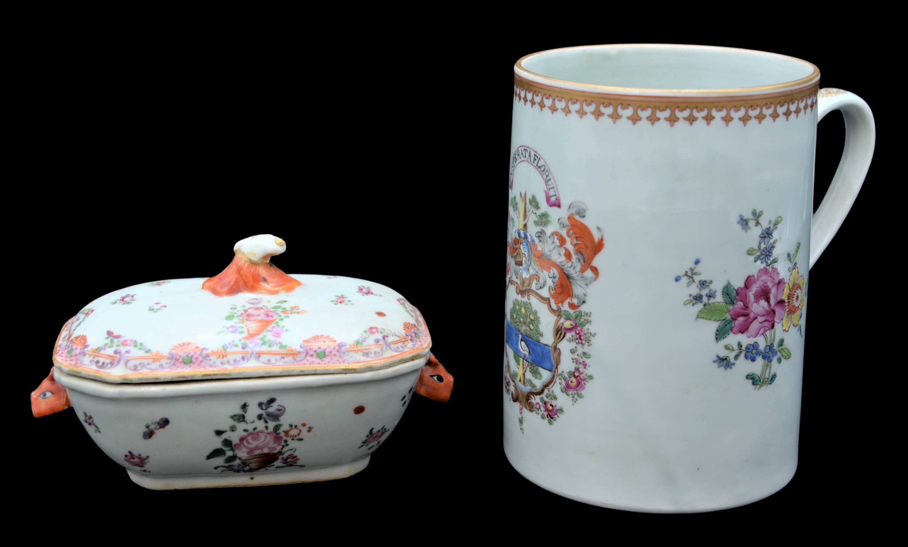 Two Chinese Export Porcelain Pieces, to include a large armorial handle mug marked “Insperata Floruit” with shield, height 7 1/4 inches; along with small tureen having boars head handles and cover, height 4 inches, width 7 inches.
