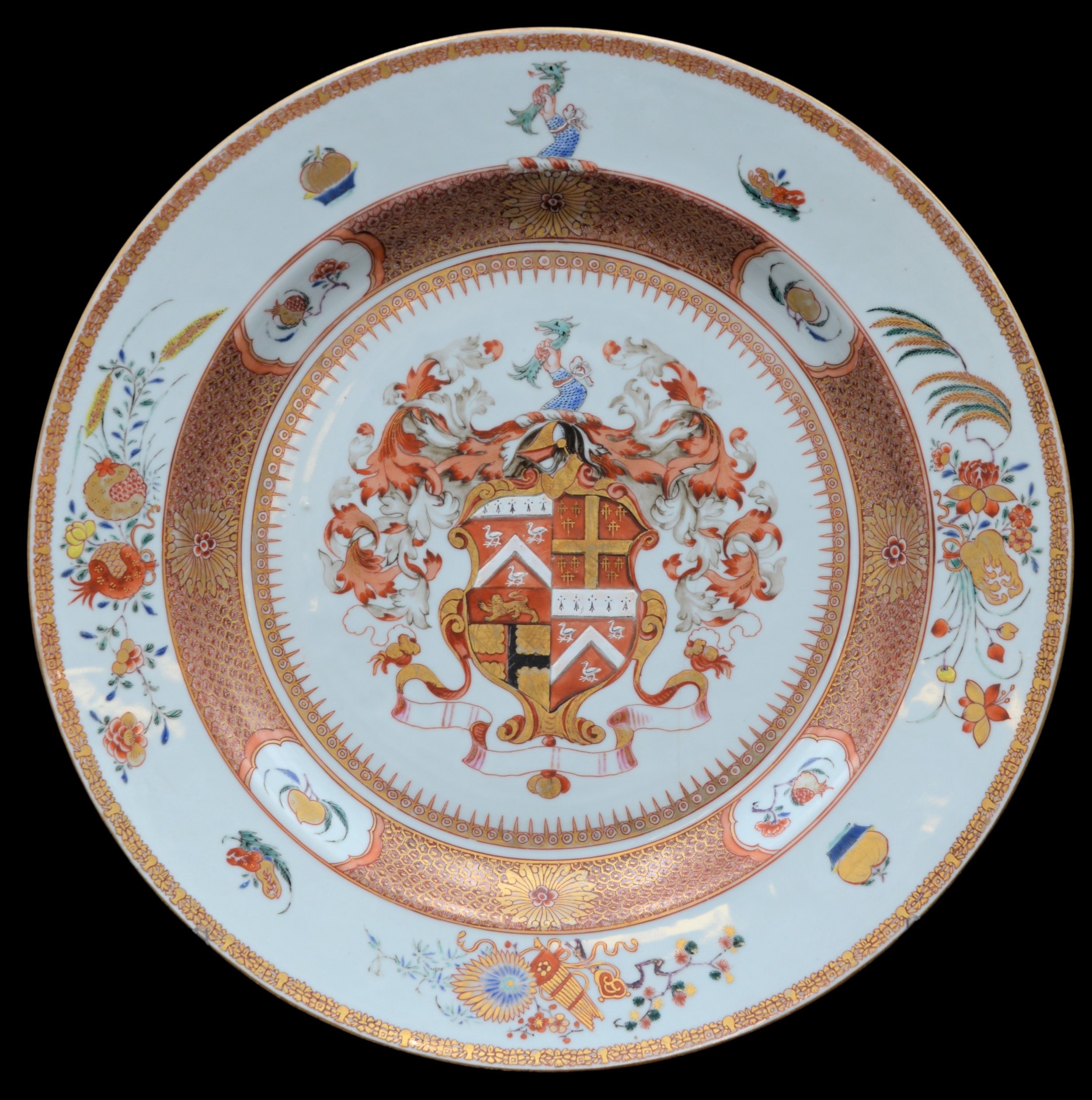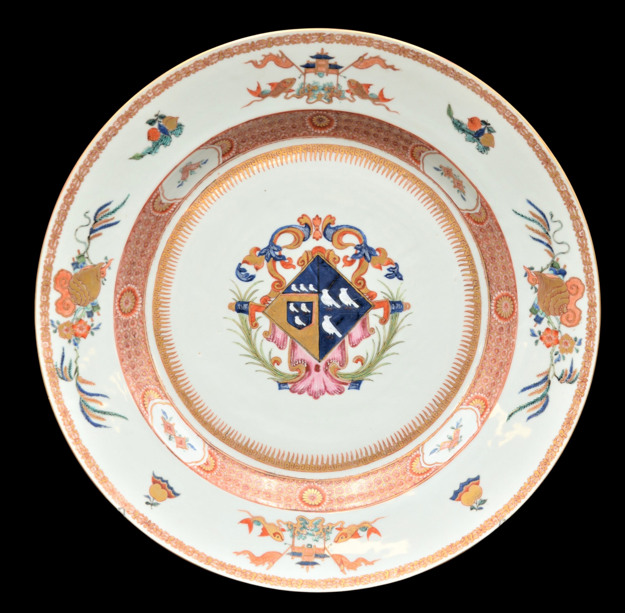 Large Leonora Chinese Export Porcelain Armorial Charger, having centralized coat of arms with enameled birds, iron red and gilt band border with stylized fruit and flowers, service made circa 1720 for Leonora daughter and heir of Charles Maresco and widow of Thomas Frederick of Westminster, in good condition with minor scratches and knife marks, height 2 1/4 inches, diameter 15 1/2 inches.