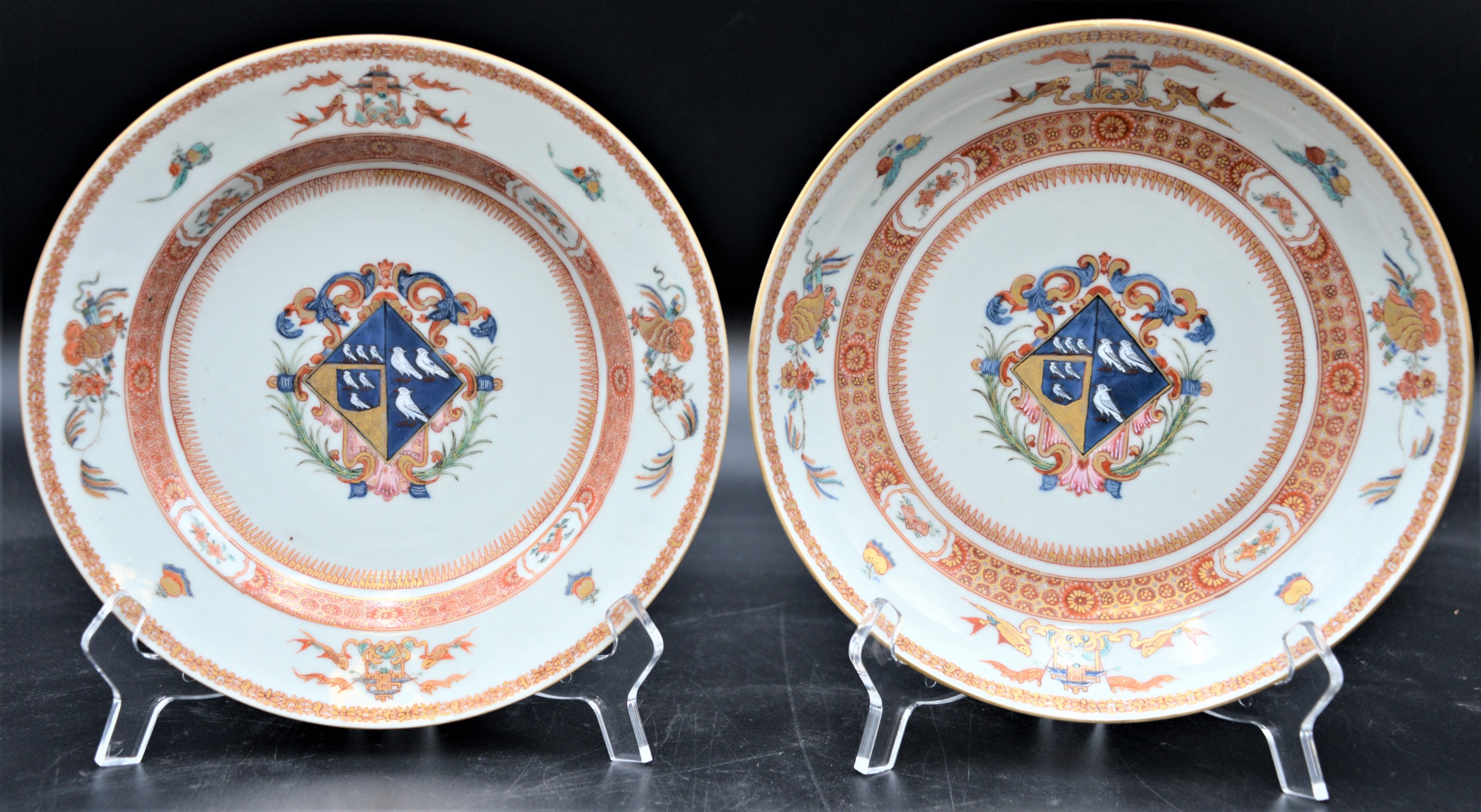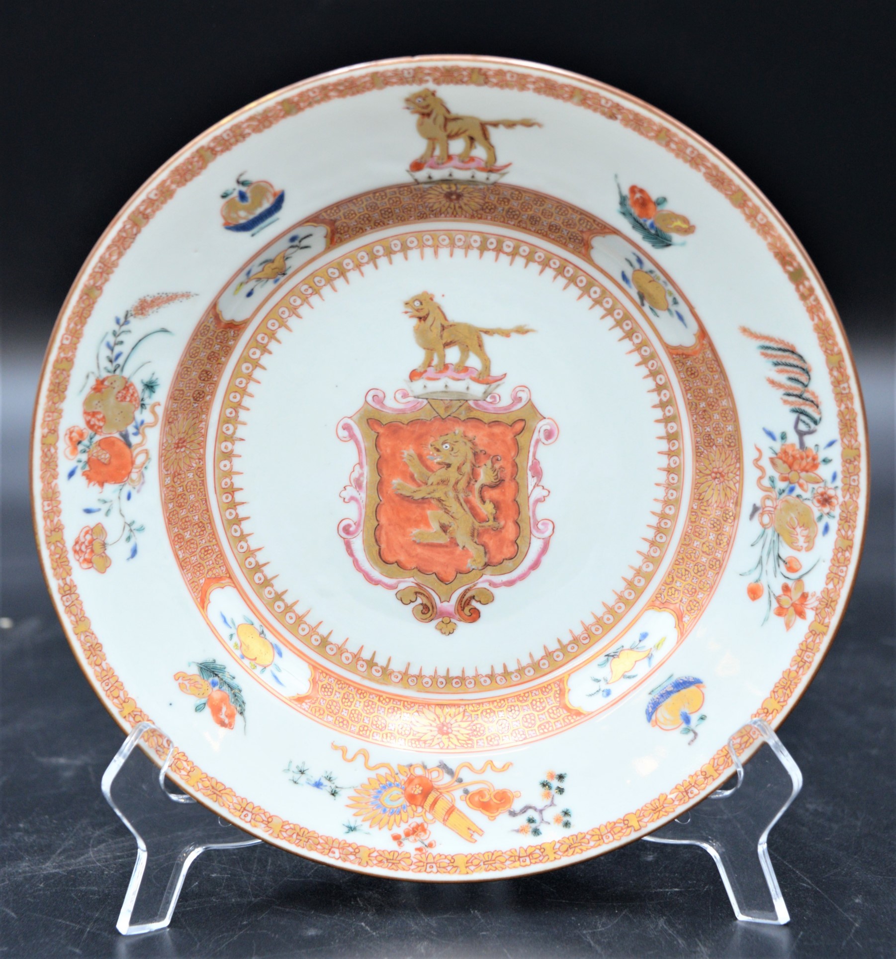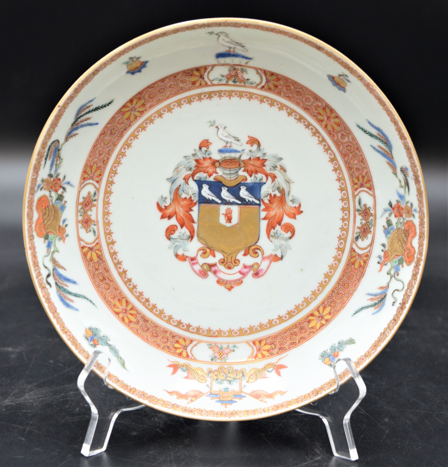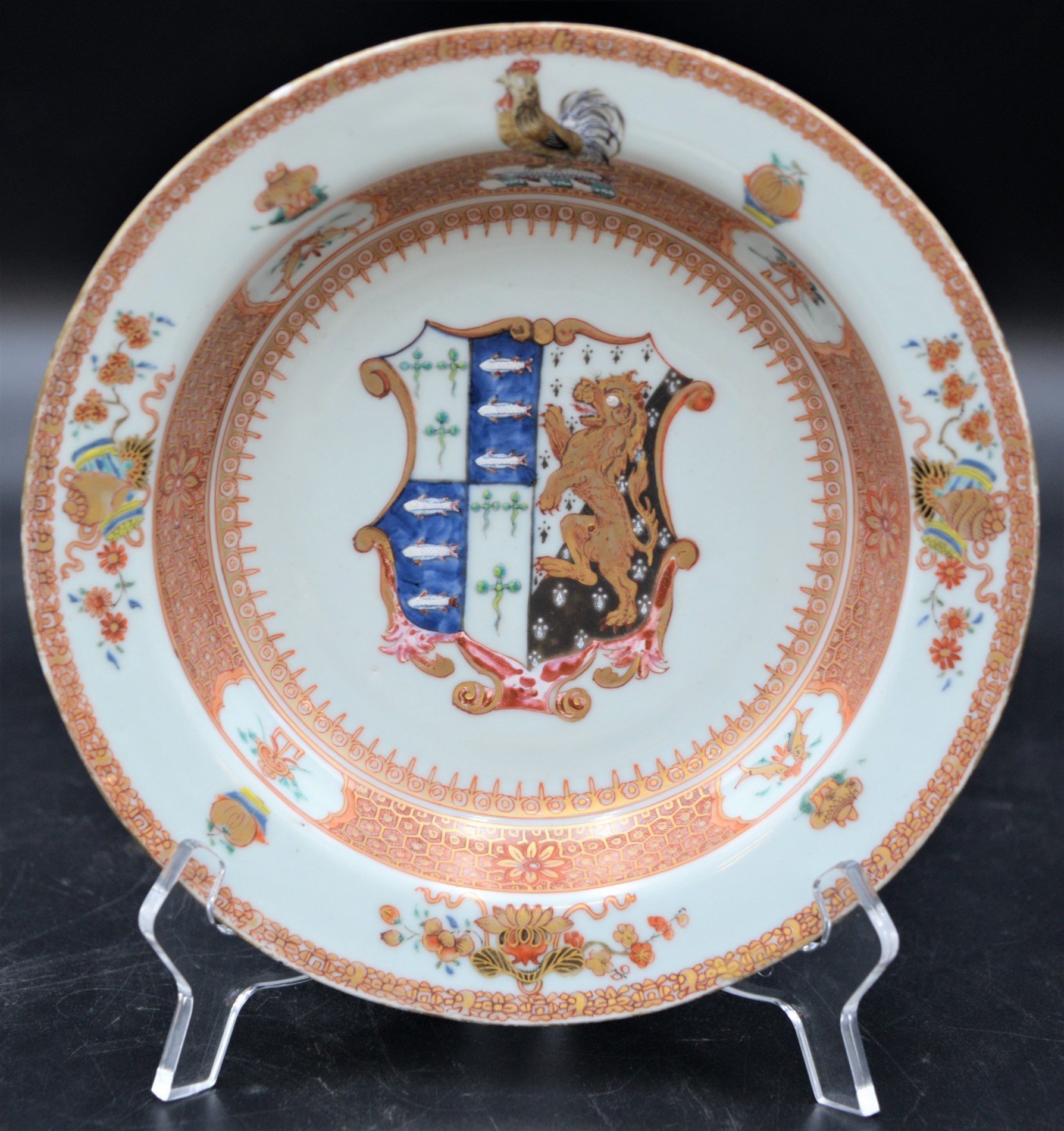 Leonora Pair of Chinese Export Porcelain Armorial Pieces, circa 1720 shallow bowl and a plate having centralized coat of arms with enameled birds, iron red and gilt band border with stylized fruit and flowers, in good condition with minor surface chips on rim, service made circa 1720 for Leonora daughter and heir of Charles Marescoe and widow of Thomas Frederick of Westminster, height 1 1/2 inches, diameter 9 inches; height 1 1/4 inches, diameter 9″,