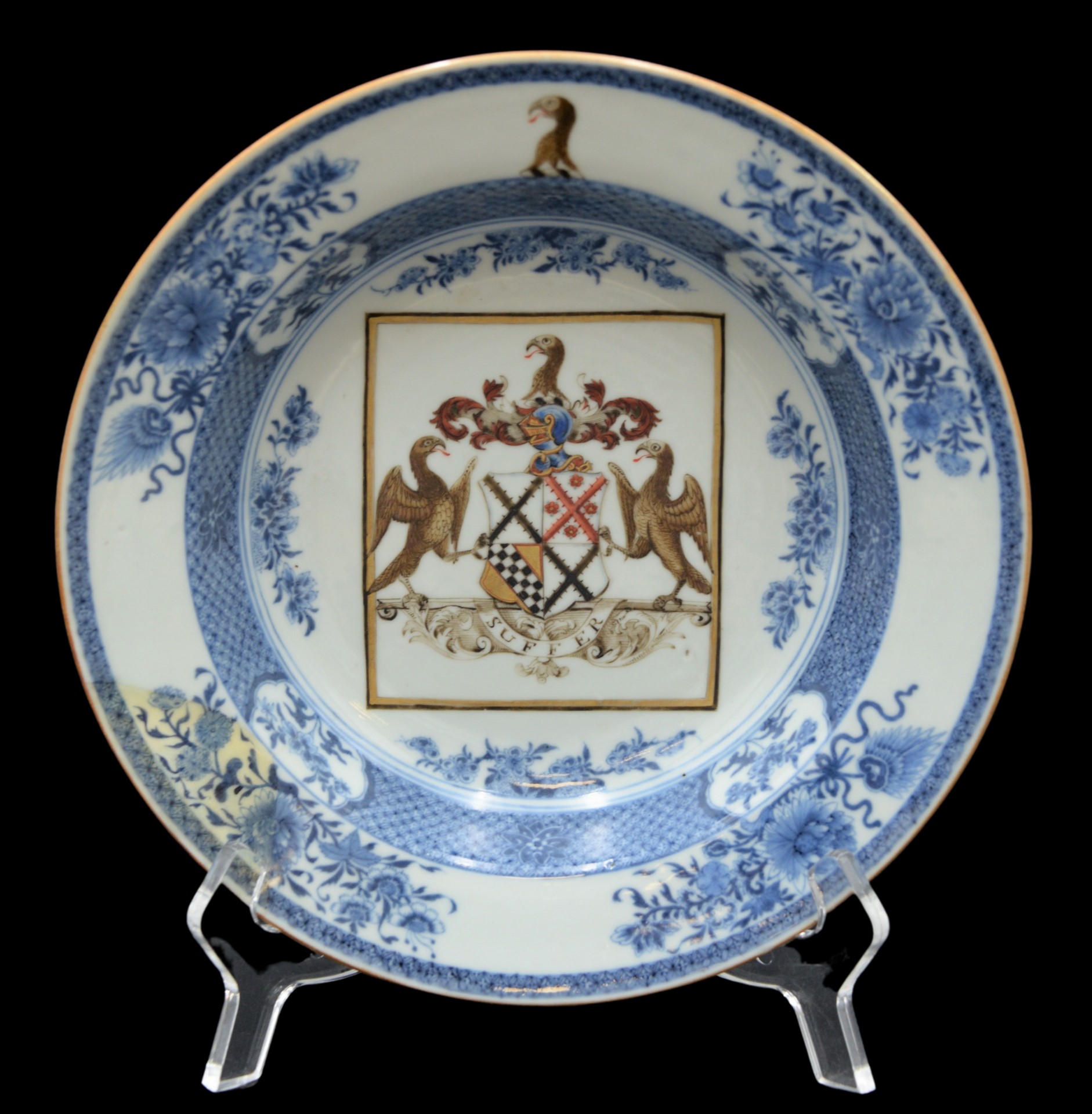 Sourced from Christie’s 2012: A soup plate from this handsome service was exhibited in A Tale of Three Cities: Canton, Shanghai and Hong Kong, London 1997 (cat pg. 56), where D.S. Howard writes “the manner of painting the armorial from a bookplate is remarkable and confirms that an actual bookplate was coloured and taken to China – the earliest recorded example of this happening” Weld Collection sticker on reverse (small hairlines and old repair). English market blue and white Armorial bowl. The Arms of Haldane in colors and gilt center as it is on a bookplate the well trim with fine painted cobalt blue decorated centering the crest from same set previously sold at Christie’s from Peter H. B. Frelinghuysen, Jr. collection, January 24, 2012.