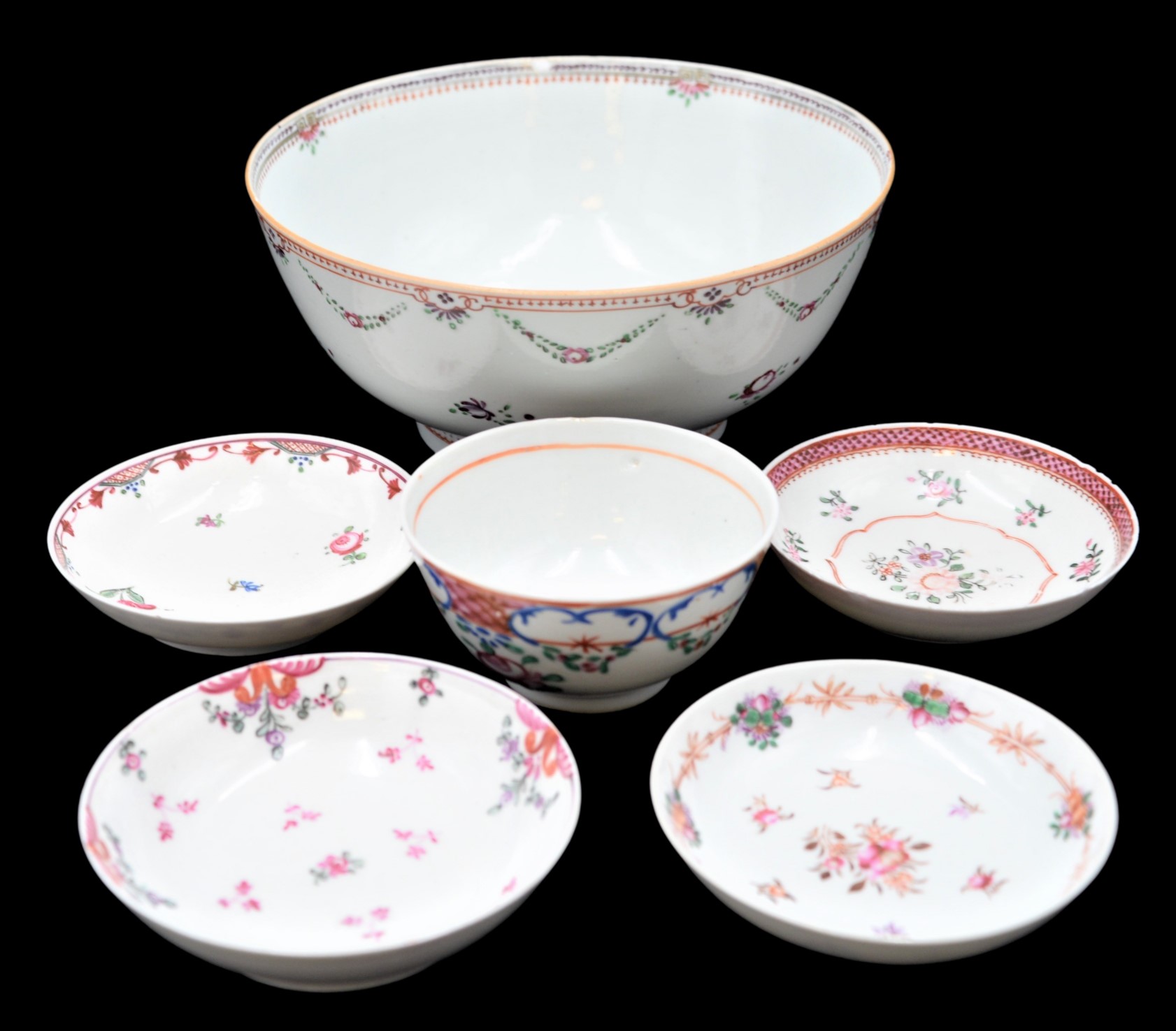Six Piece Chinese Export Porcelain Lot, to include a large bowl, four small dishes, one small bowl, having slight dings, chips, and flakes, diameter 4 1/2 inches – 9 1/8 inches.