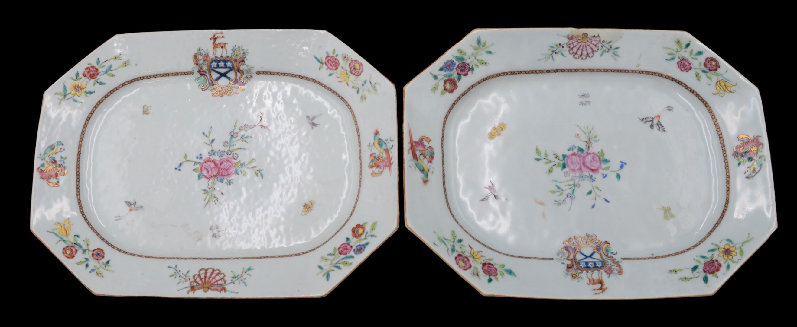 A Pair of Chinese Famille Rose Armorial Platters, 18th/19th century, the octagonal shape is delicately decorated with central flower and surrounded by a border of birds and flowers, the armorial crest or coat of arms featuring stars and deer, having no mark, length 11 1/4 inches.