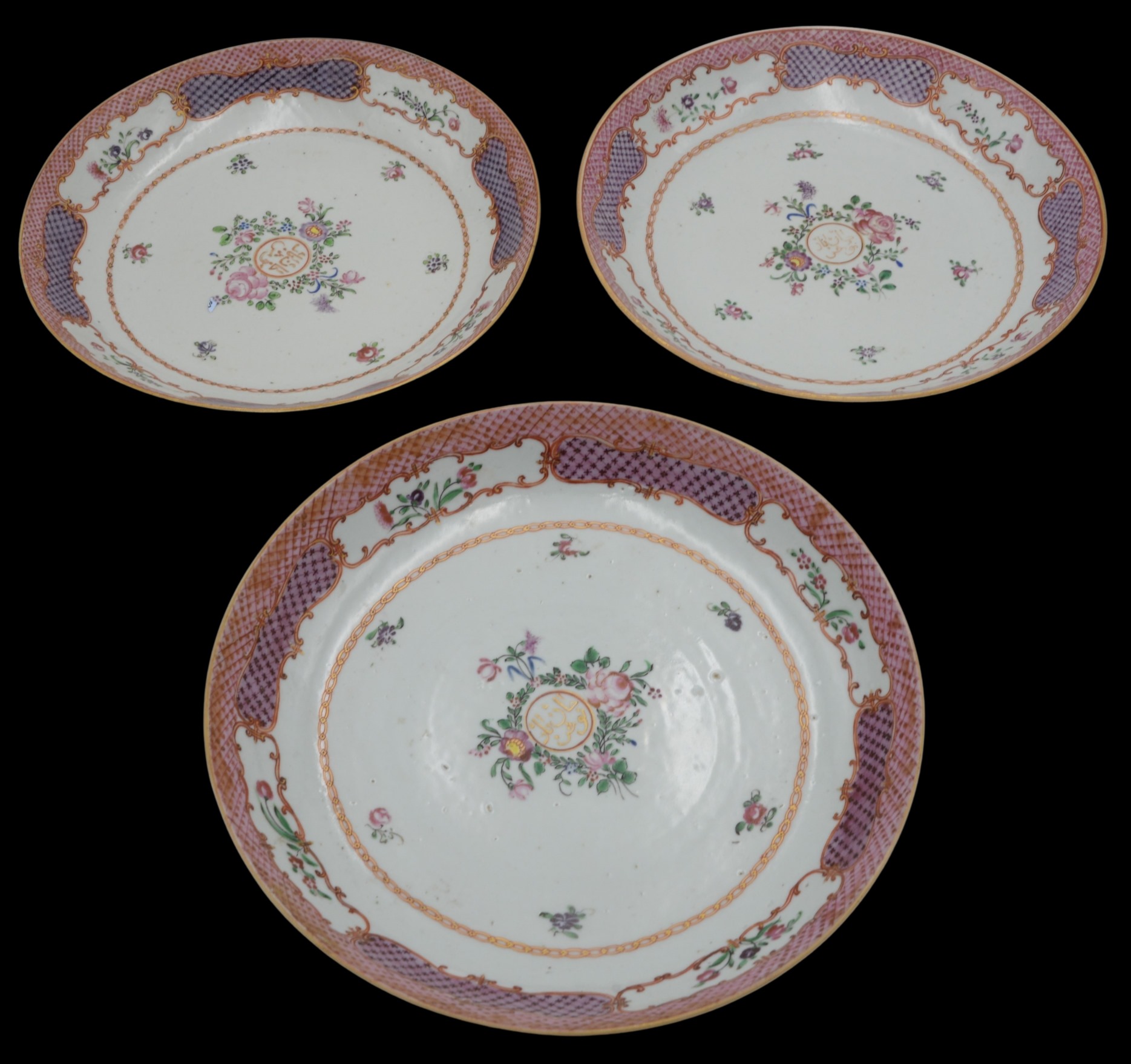 Three Chinese Famille Rose Export Plates, 18th century, for the Islamic/European market, comprised of a pair of 8 inch plates and a matching 10 inch plate, all decorated with a central circle with a gilt Arabic script and surrounded by flowers, the intricate border in a French/European style.