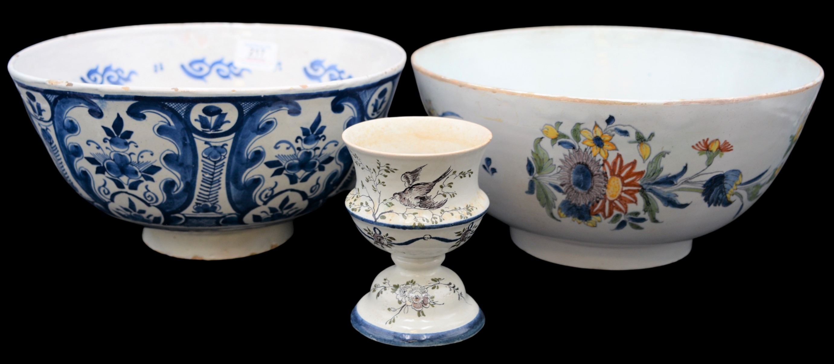 Three Piece Group of Delft Group, to include bowl having various blue, red and yellow flowers on a white ground with small group of flowers inside bowl, repaired, height 6 inches, diameter 12 1/2 inches; a blue and white bowl, circa 1725, painted in the center with two birds on flowering branches, the exterior with cartouches containing fruits, on a circular foot (base restored); along with a stem cup marked Delft, diameter 12 inches.