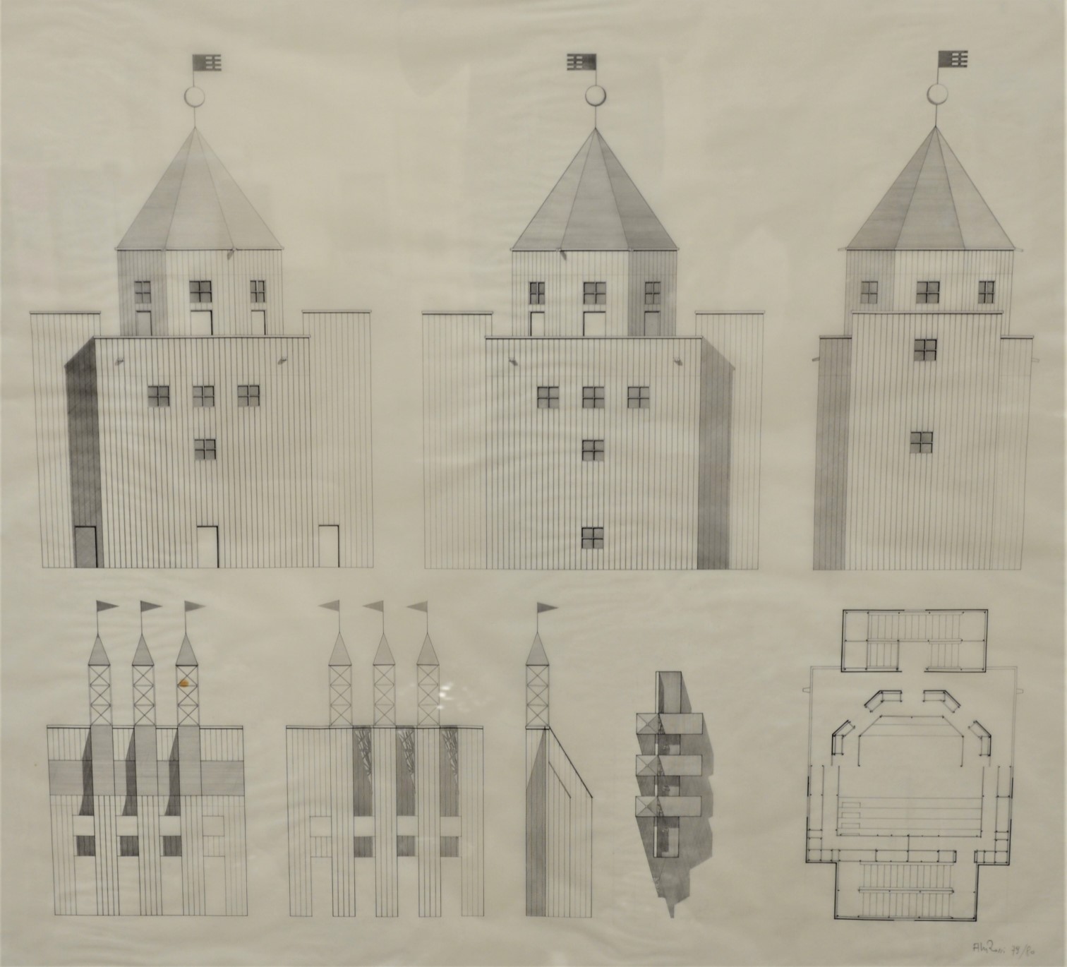 composite drawing of Teatro del Mondo & the Porta Biennale, 1979
