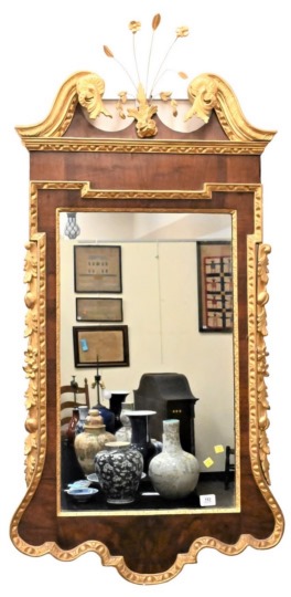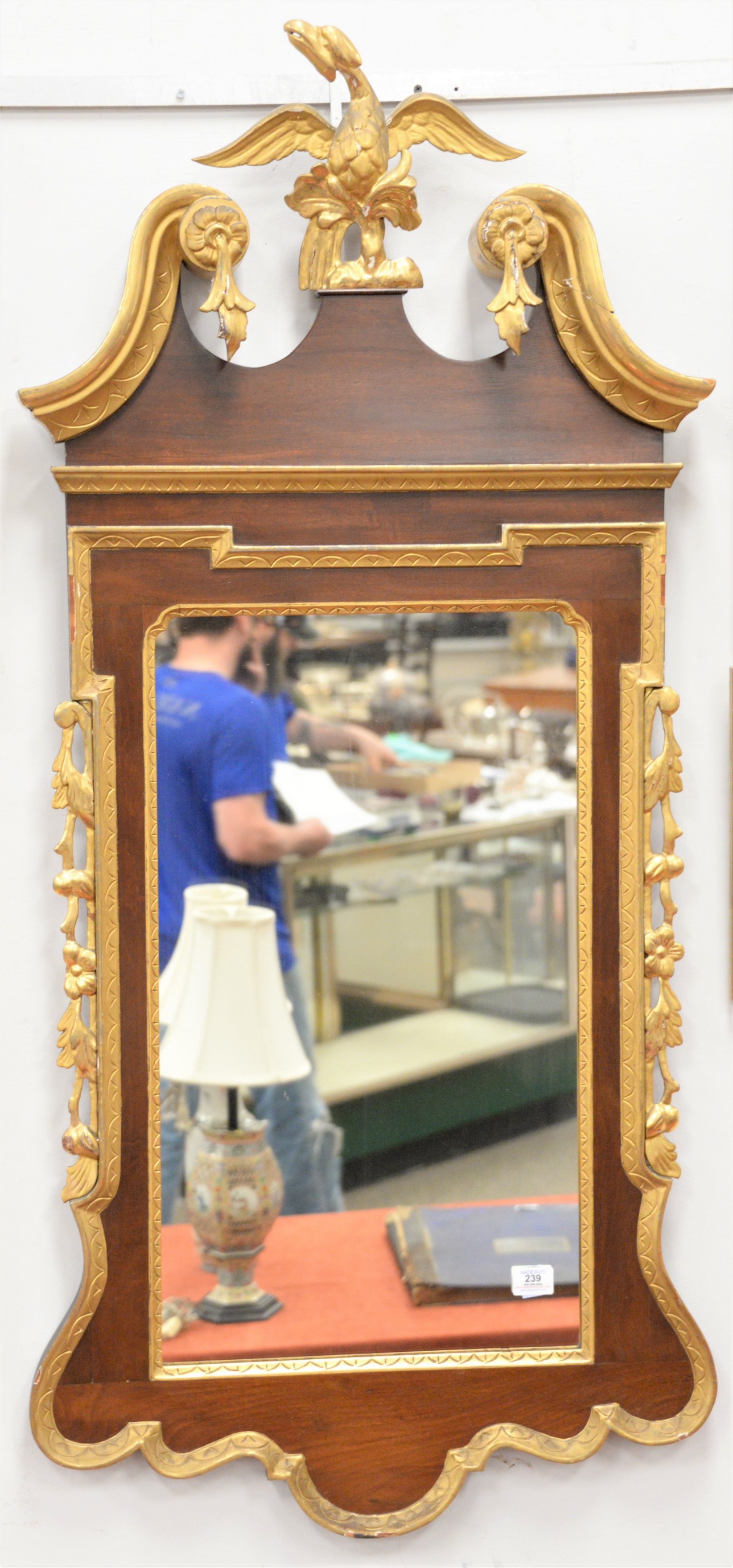 Chippendale Style Custom Mahogany Mirror, with gilt eagle top in broken pediment top, early to mid 20th century, 54″ x 27″ with frame, 27″ x 15 1/2″ mirror.