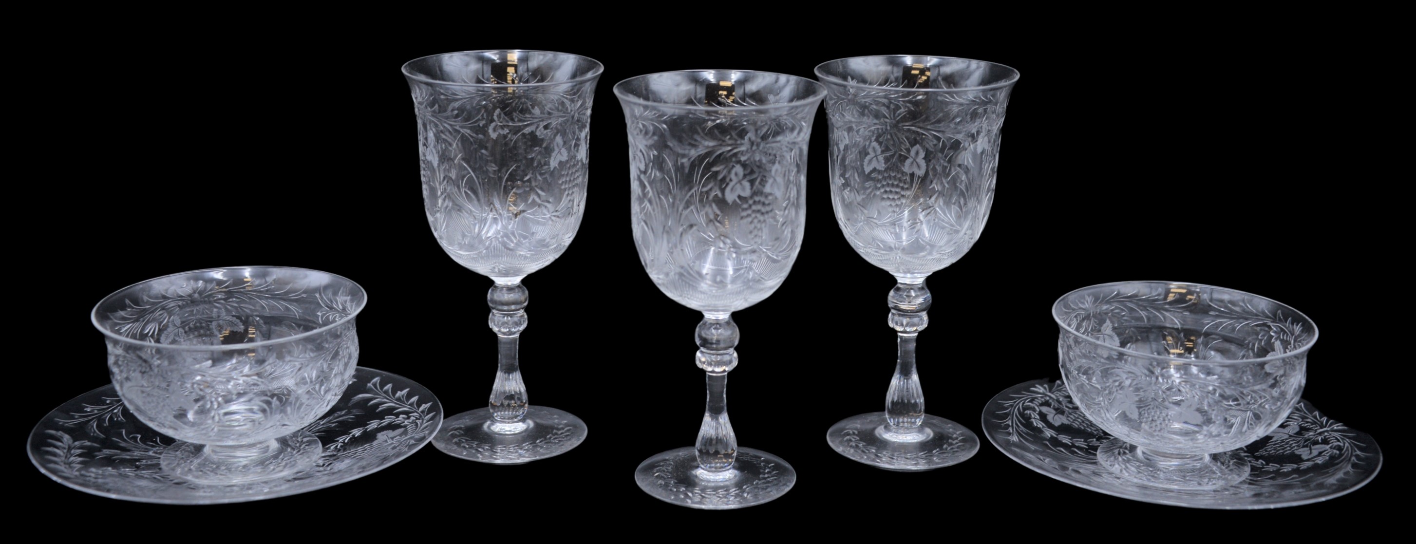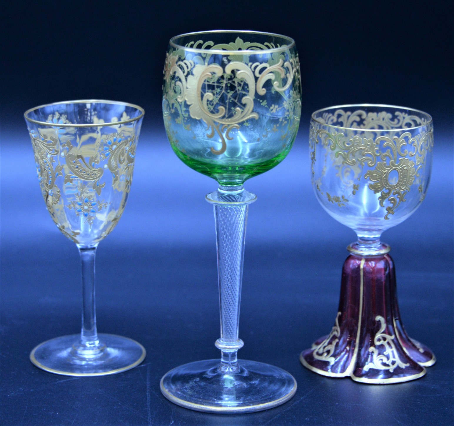 20 Piece Group of Bohemian and Crystal Art Stems, to include a set of nine wines having blue and gold enameling, eight with gilt decoration, cranberry petal bases with three gilt decoration, green bowls on air twist stems, height 5 inches to 6 3/4 inches.