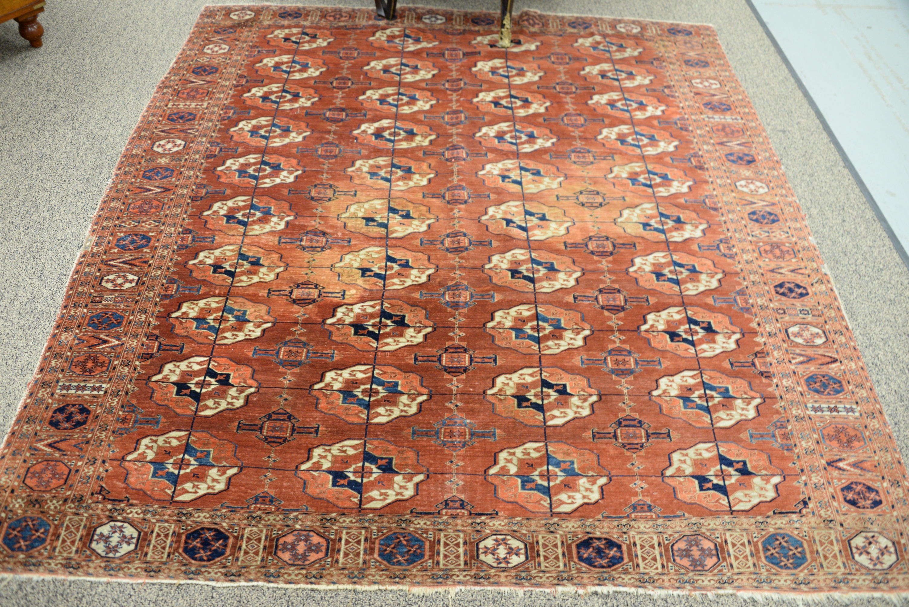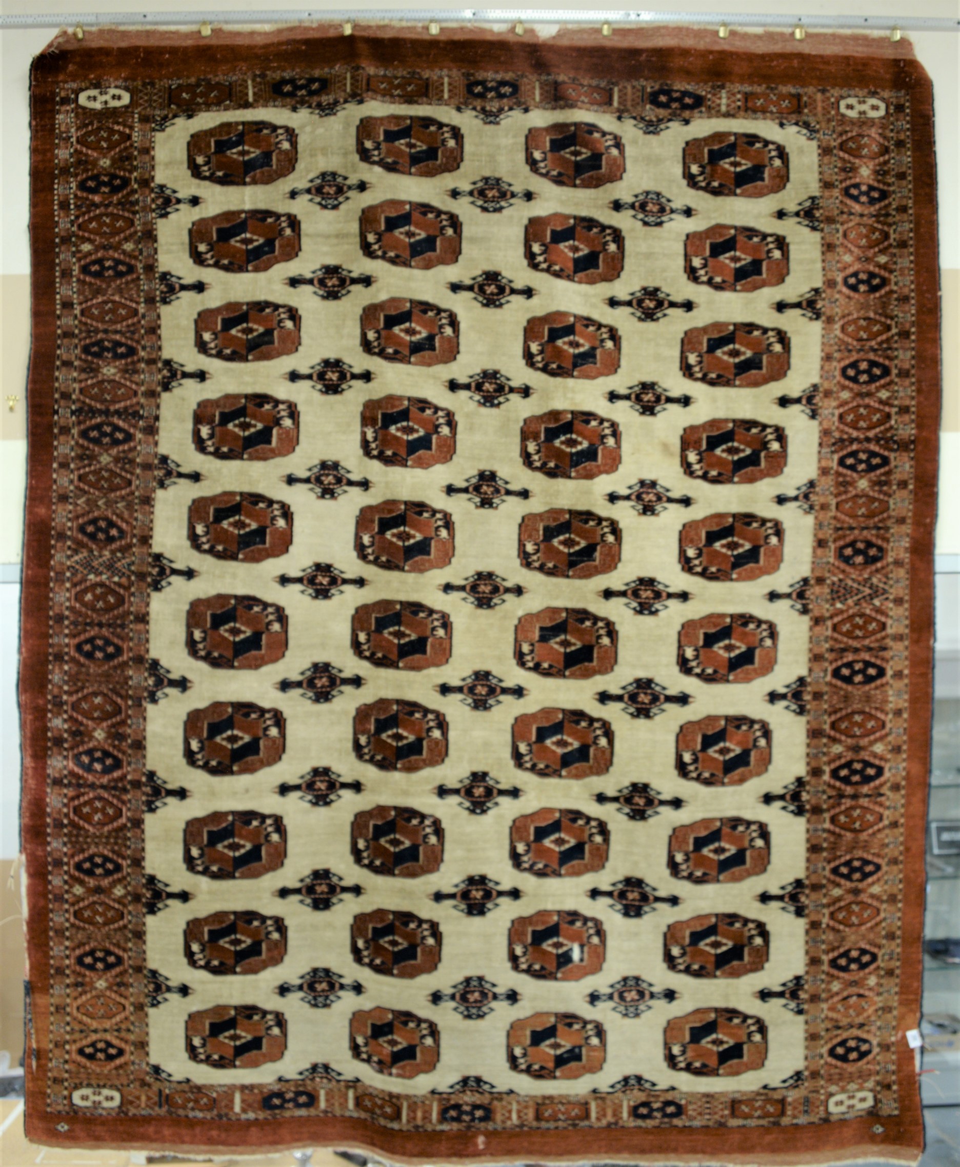 Yomud Turkoman Carpet, having ivory ground with four rows of unconnected major gulls, ten per roll, along with arrow, minor gulls surrounded by border and repeating,, stepped octagonal medallions with four pinwheels, part of original Kilim remaining at both ends, third quarter of the 19th century, having small hole and slight stain from fading, 6′ 6″ x 9′ 2″