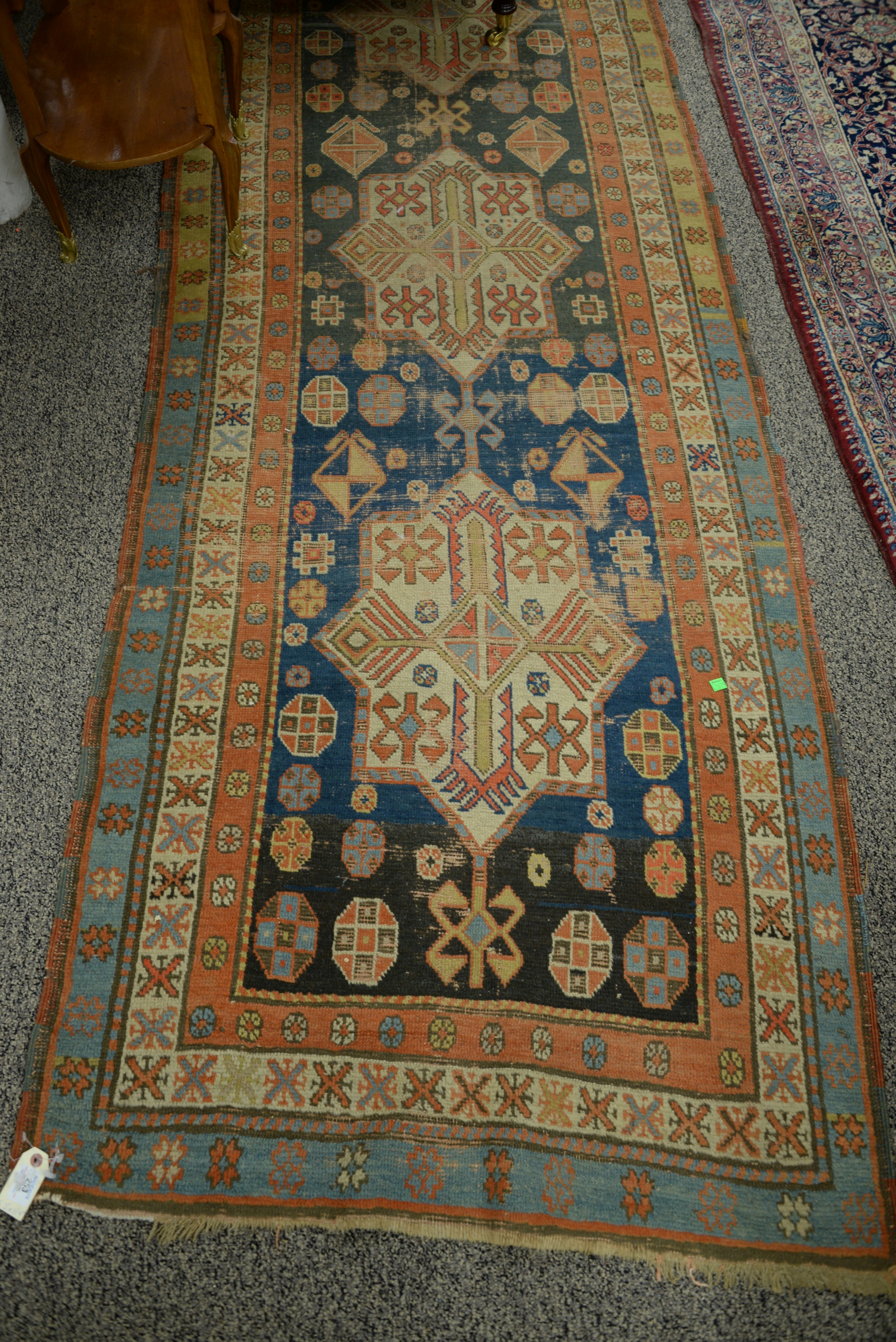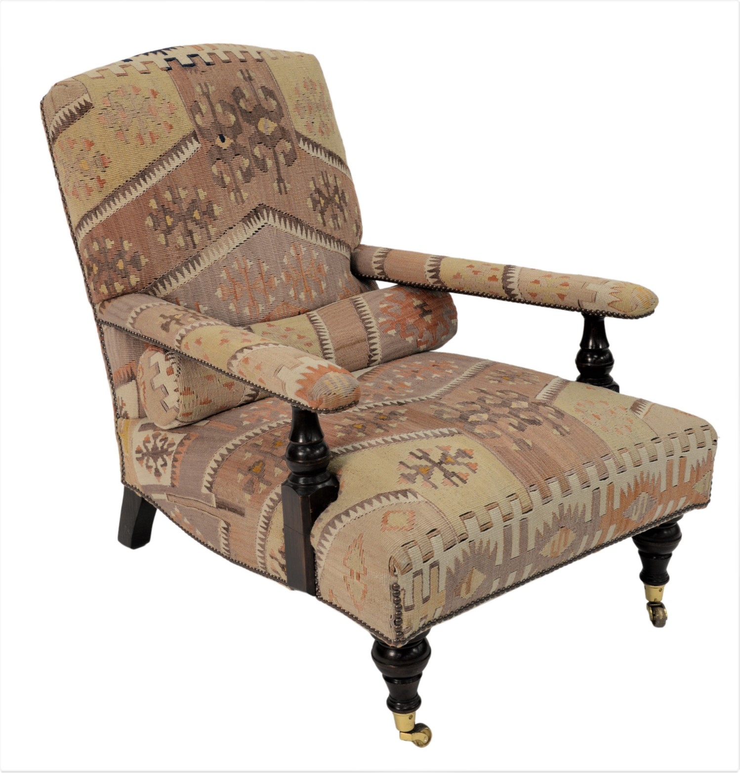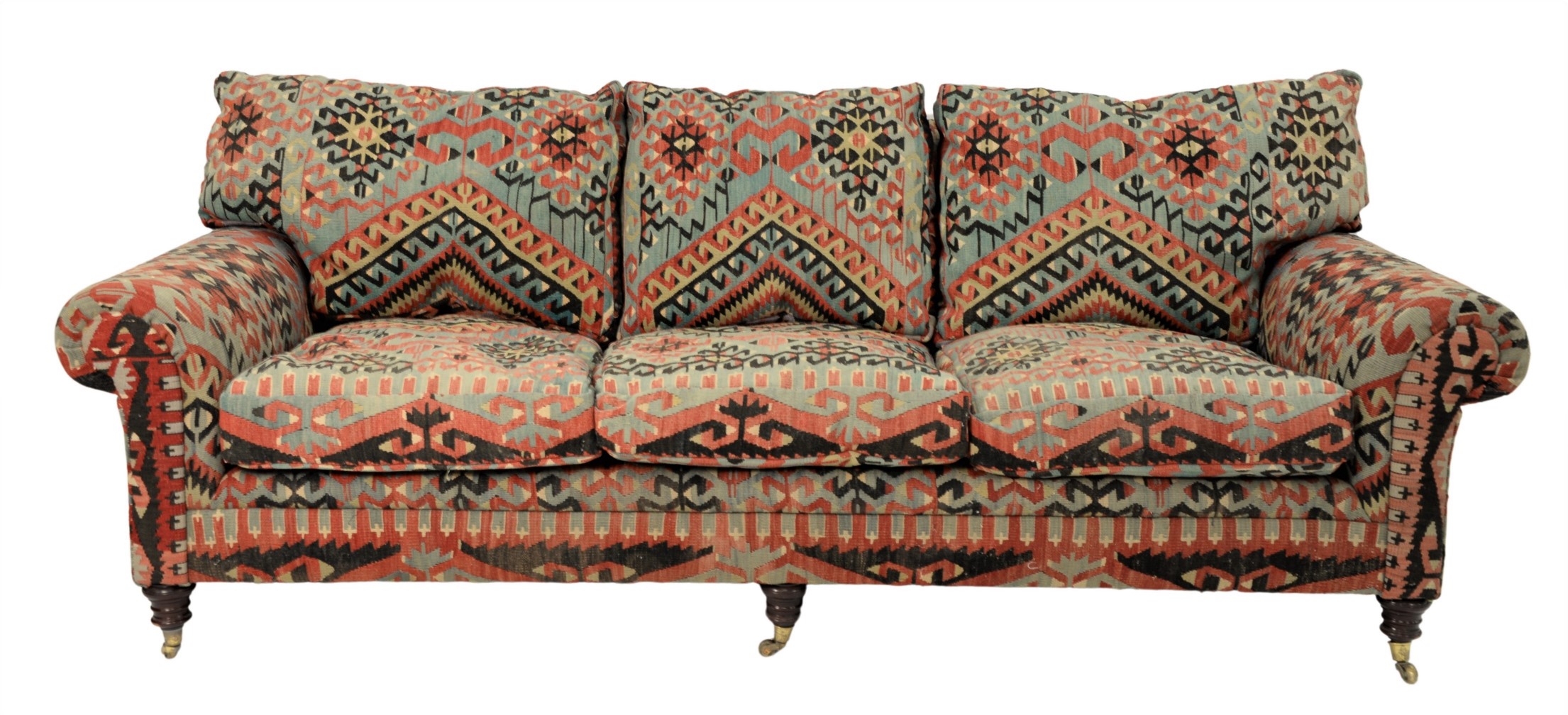George Smith Kilim Upholstered Sofa, three cushion back and seat, on turned legs, (some fading), height 35 inches, length 92 inches, depth 43 inches.