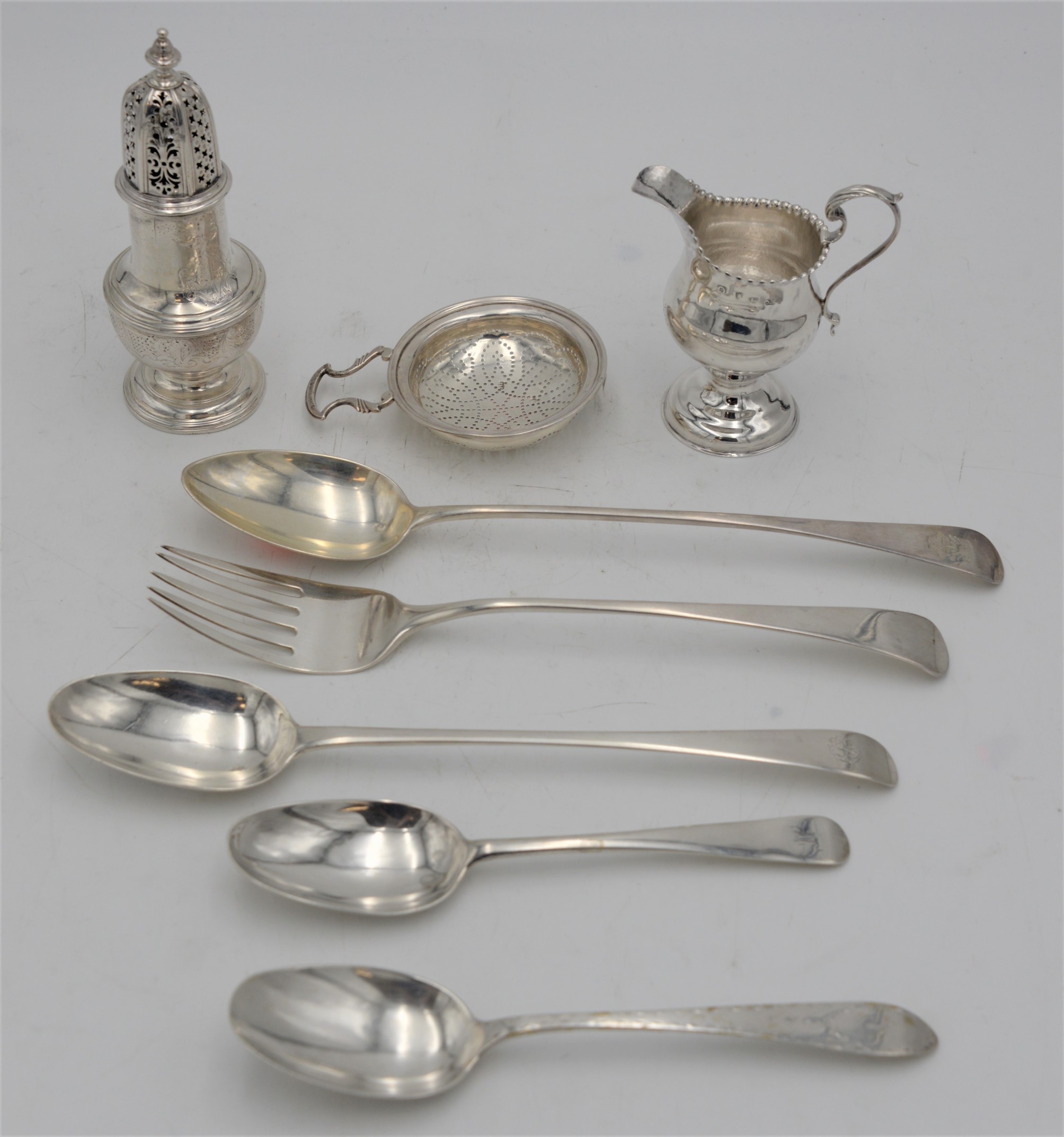 Eight Piece Sterling Silver and Silver Plated Group Serving Lot, to include four spoons, one fork, tea strainer, and cream pitcher, height 3 1/4 inches, James II Galleries NY 1998; along with a silver caster, hallmarks on bottom, 20.07 oz.