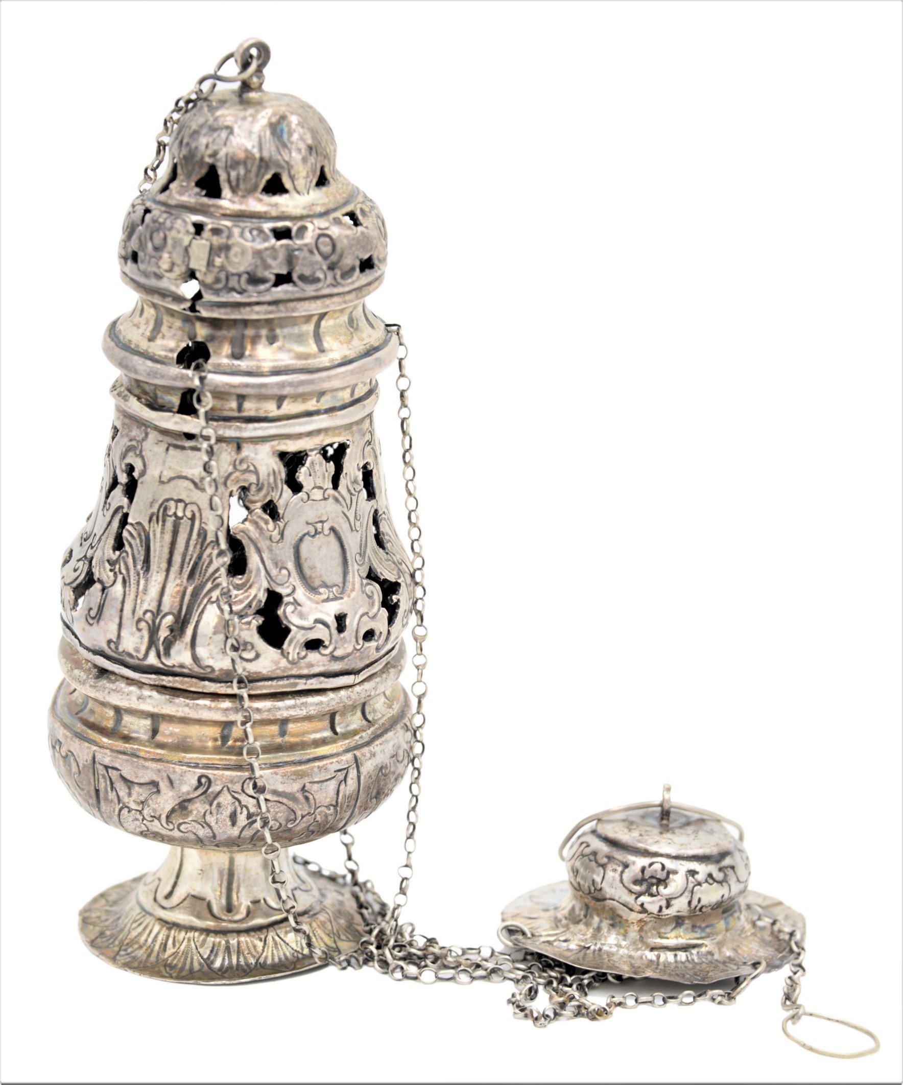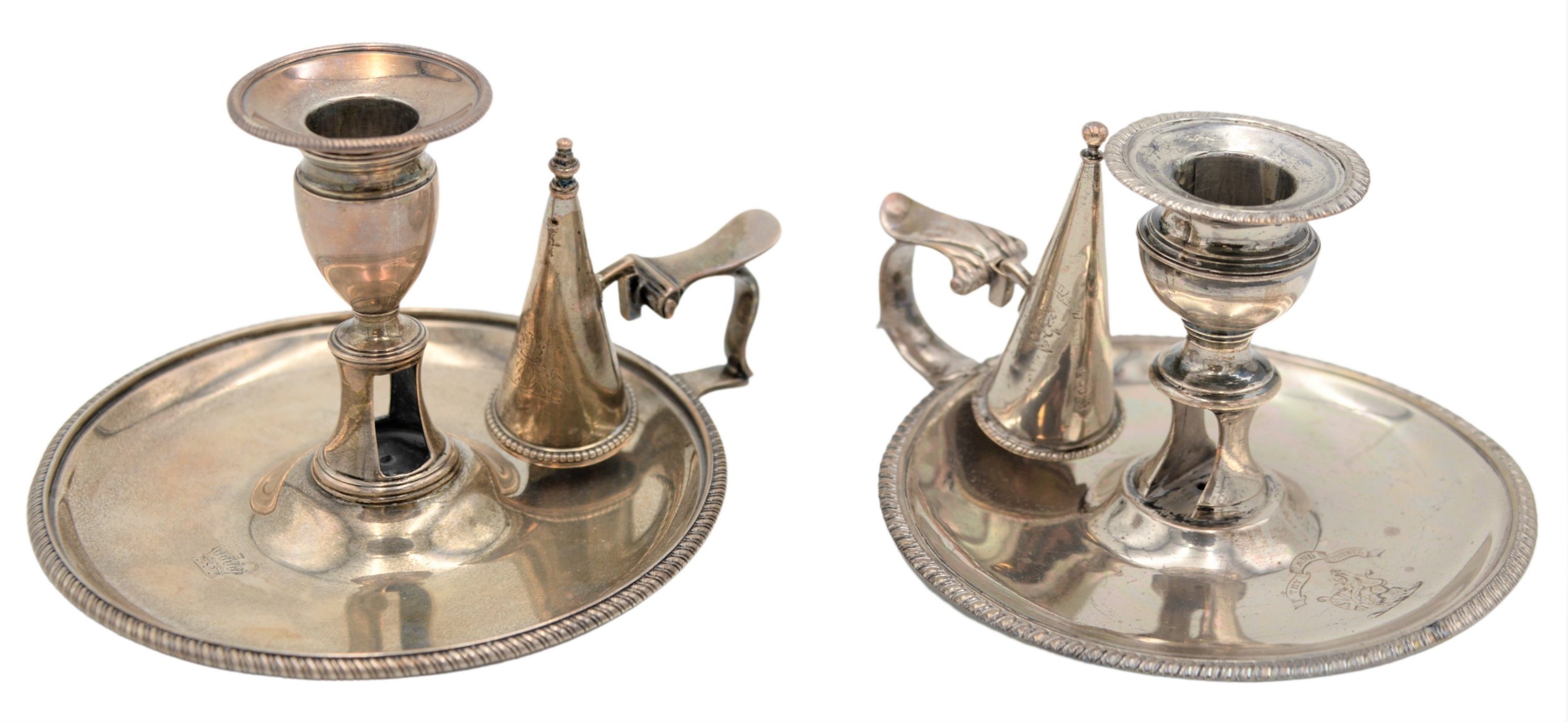 Two George III Silver Chambersticks, complete with snuffers, one possibly William Simmons, one marked G.C., each late 18th – early 19th century, each with family crest, height 4 and 4 1/2 inches, 20.6 oz.