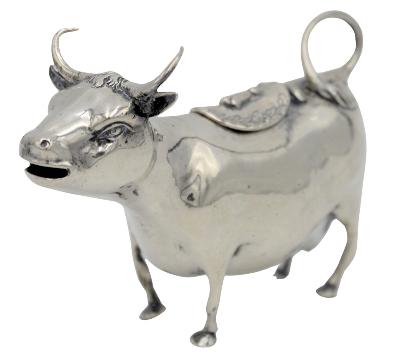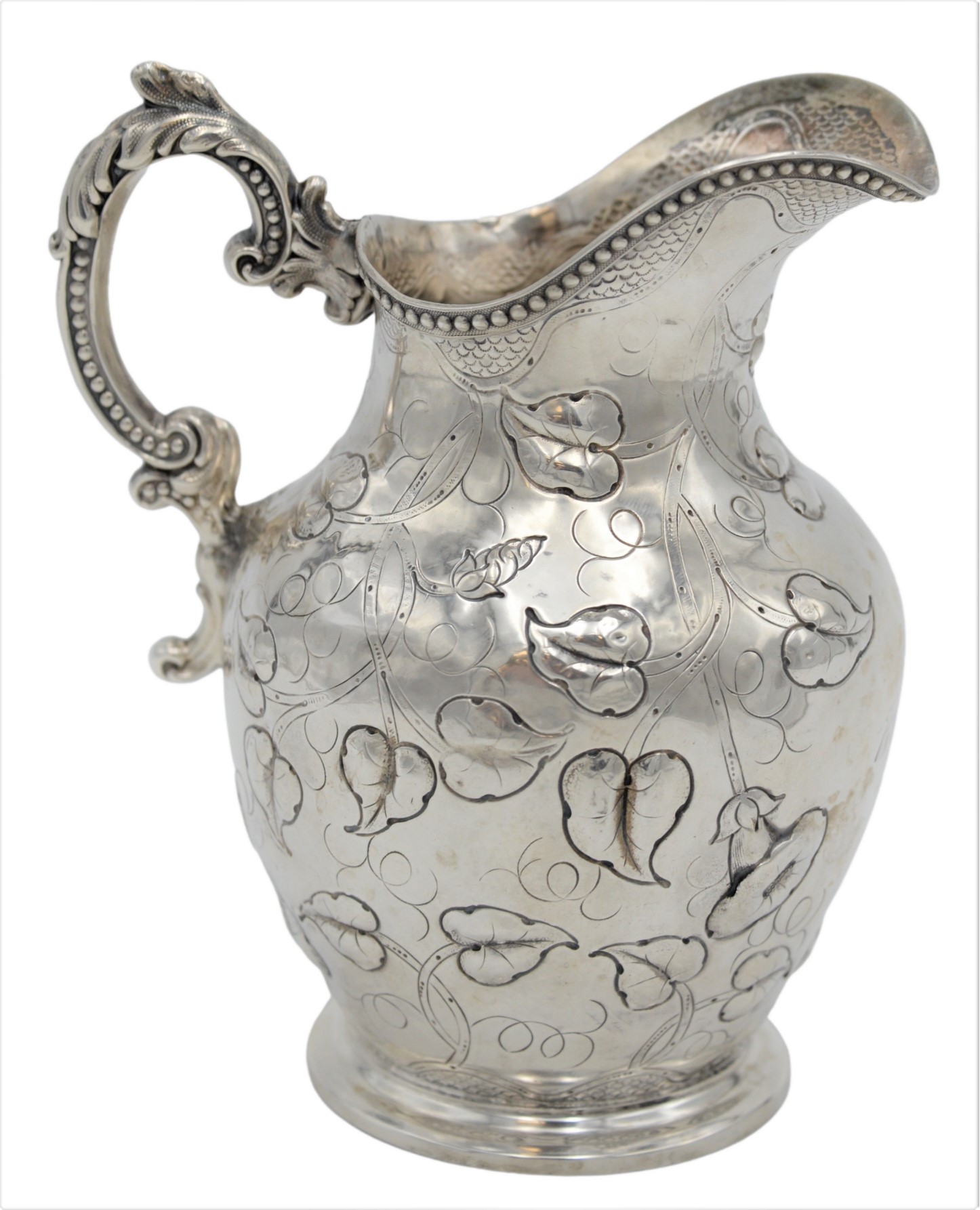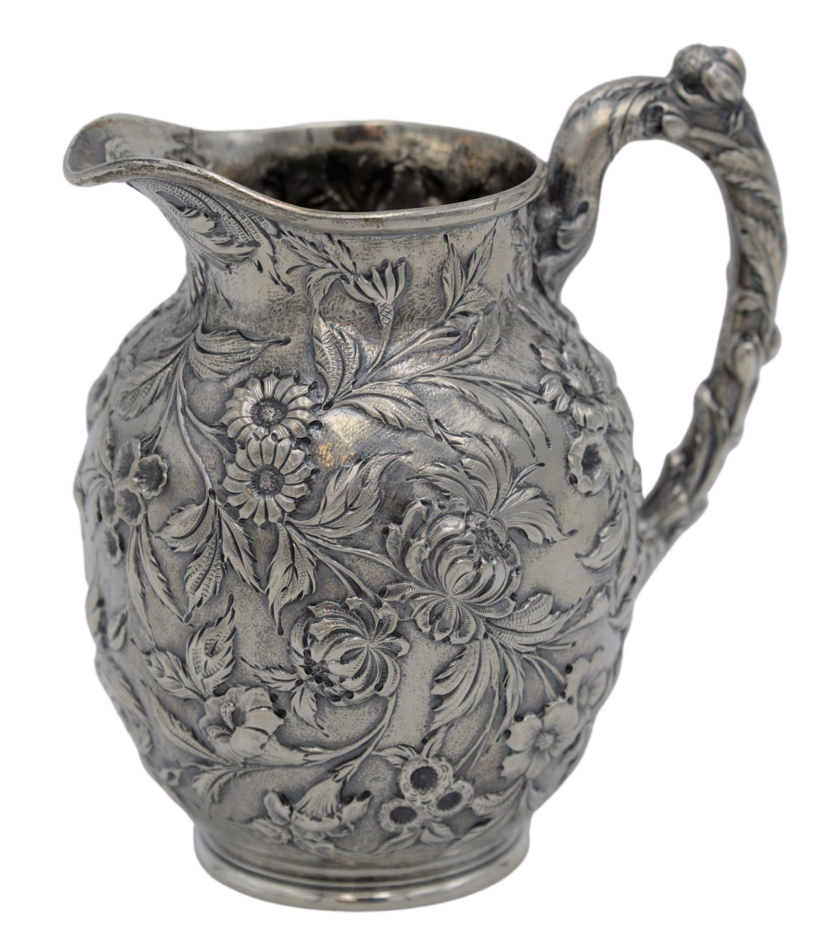 Coin Silver Creamer, having repousse body mounted with beadwork handle, top edge monogrammed “B.C.A.M.A.” (Boone County Mo. Amateur Mule Association), bottom having mark of James Watson, Philadelphia, height 6 1/4 inches, 6.5 t.oz.