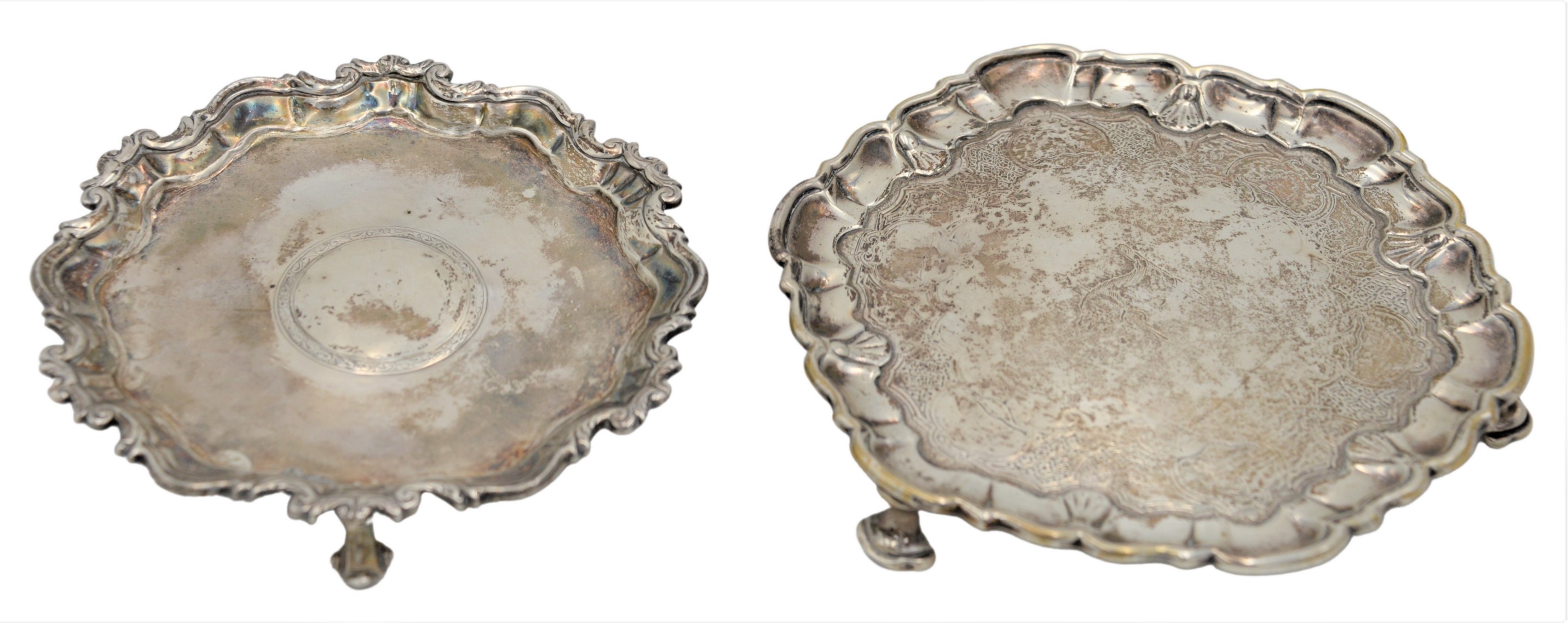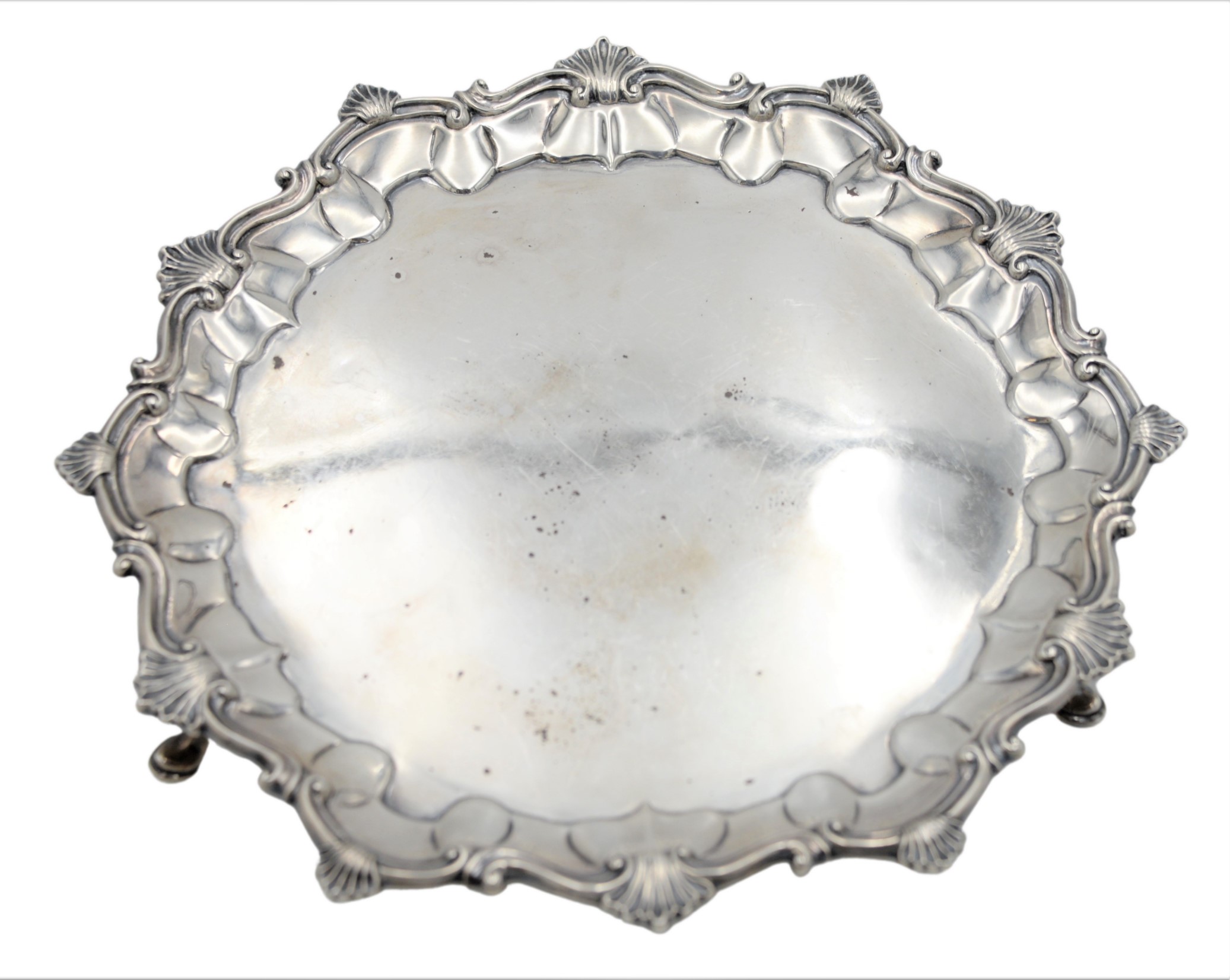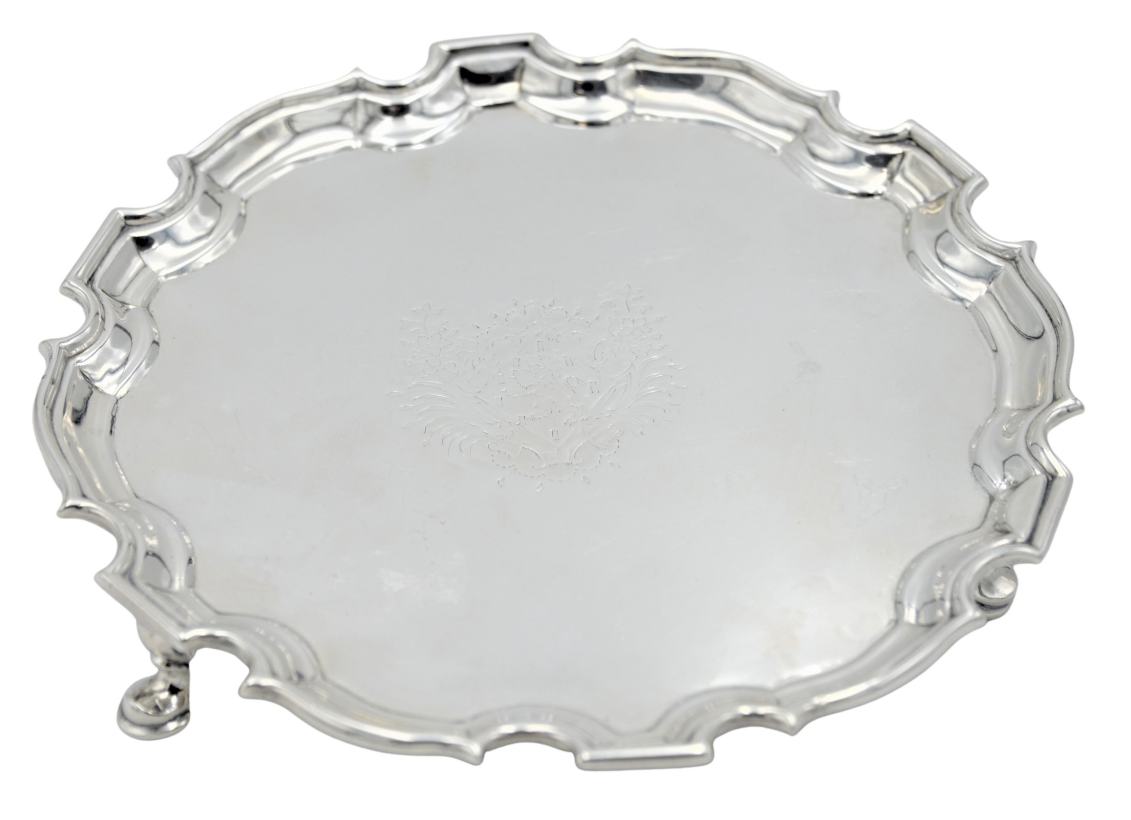 George II Silver Circular Salver, Francis Pages, London, 1733, having Chippendale rim set on three hoof feet, the center engraved with rococo armorials, the underside engraved with initials TBM, diameter 8 1/8″, 13.2 toz.