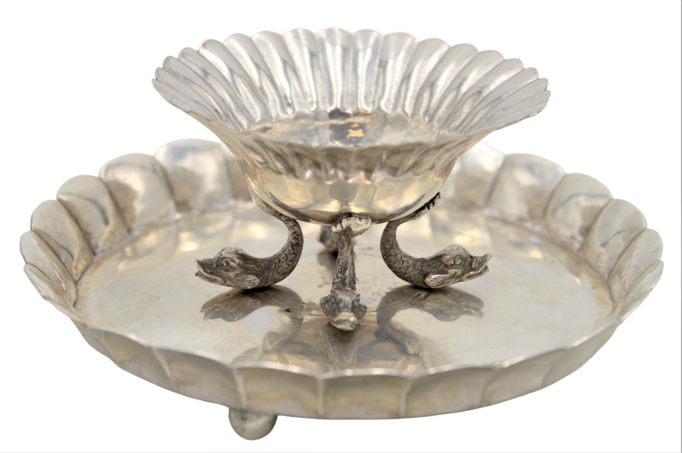 Sterling Silver Tiered Dish for Shrimp Cocktail, top tier supported by four dolphins, height 3 1/2 inches, diameter 7 1/2 inches, 17.5 t.oz.