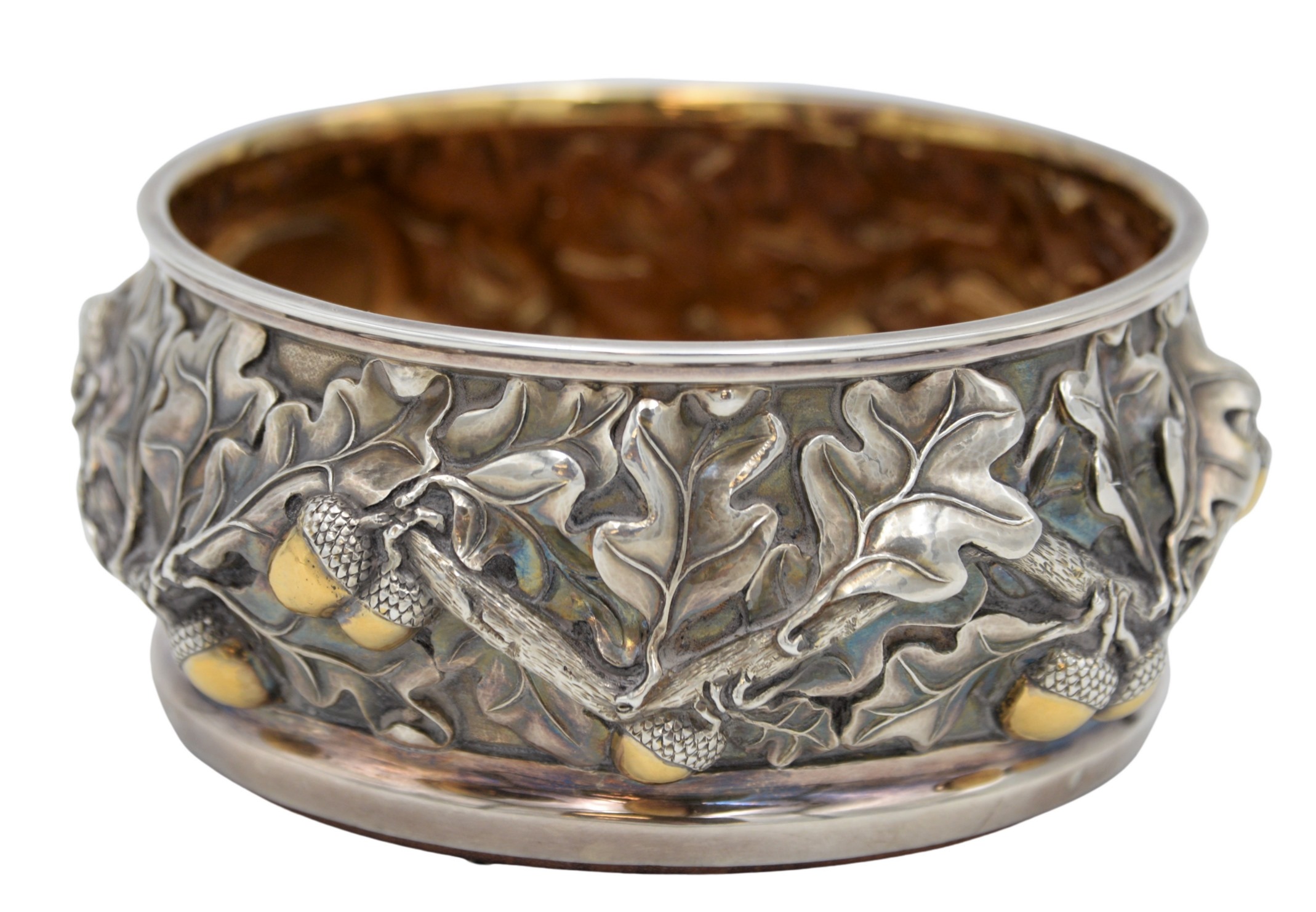 R.A. Butler Sterling Wine Coaster, having repousse oak leaves with gilt decorated acorns and vermeil interior with wooden base, height 2 5/8 inches, diameter 5 inches.
