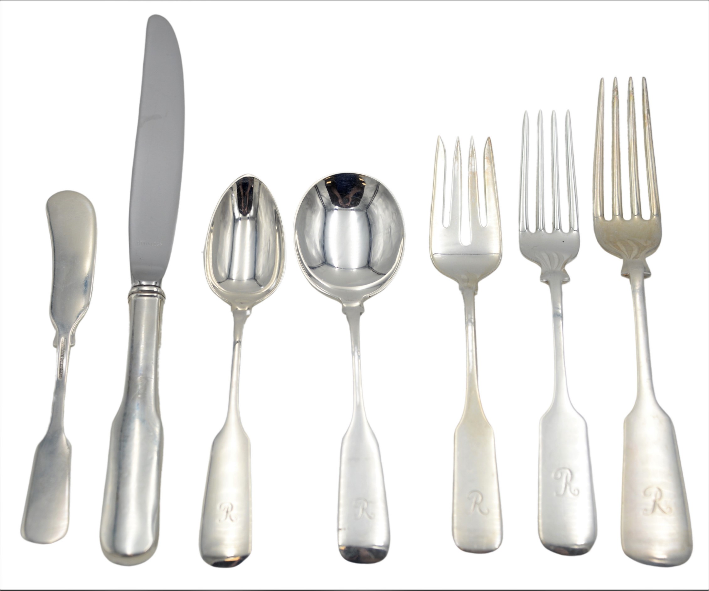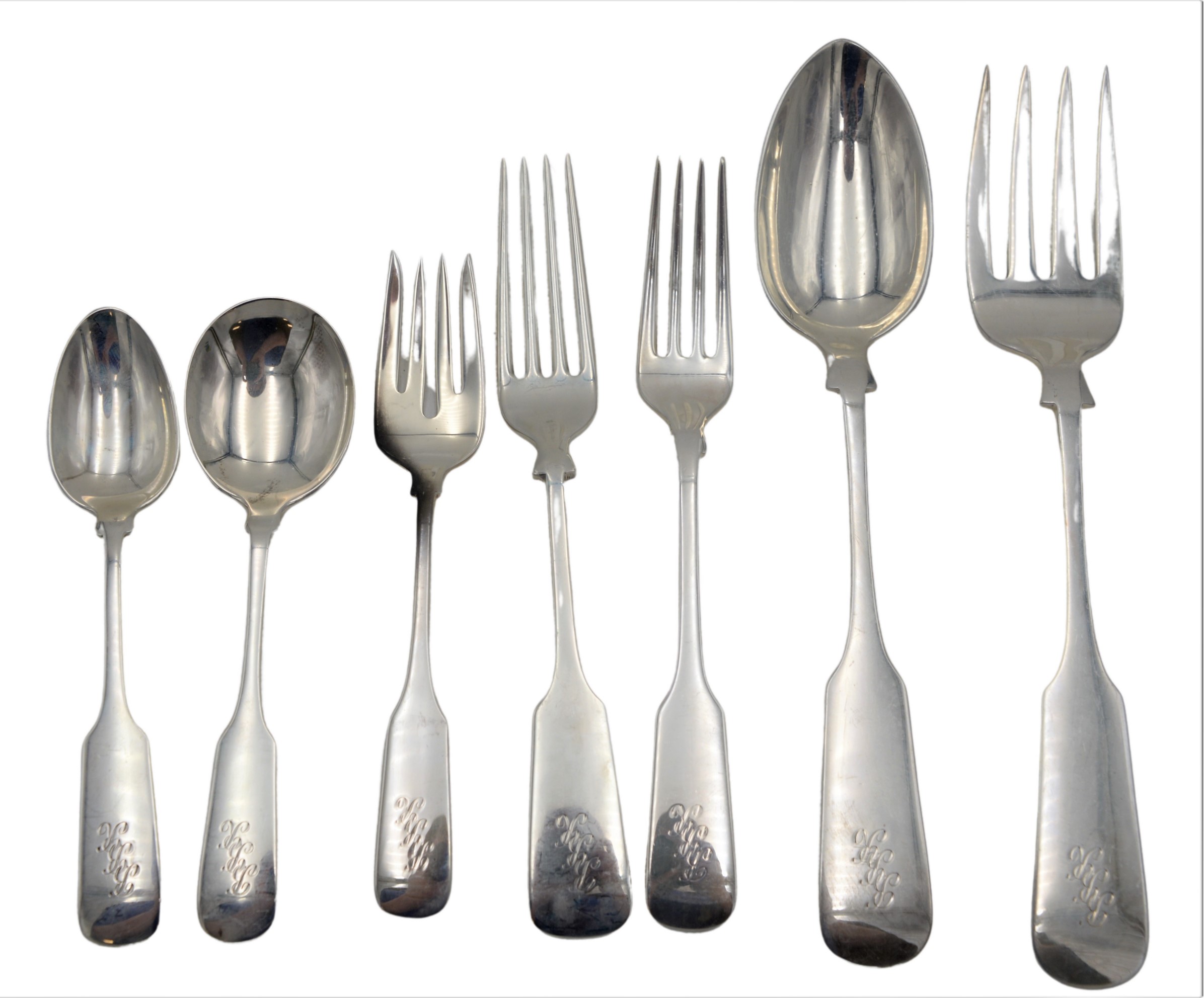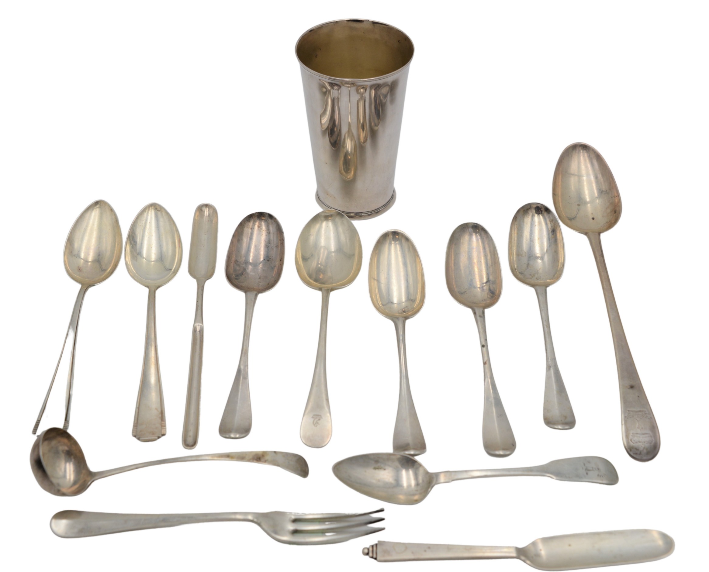 14 Piece Group of Silver, to include six spoons, a Hester Bateman Murrow spoon, a Peter Ann and William Bateman mug, height 5 inches, (possibly Hester Bateman), five large early spoons, along with six pieces of sterling, 33.6 oz.
