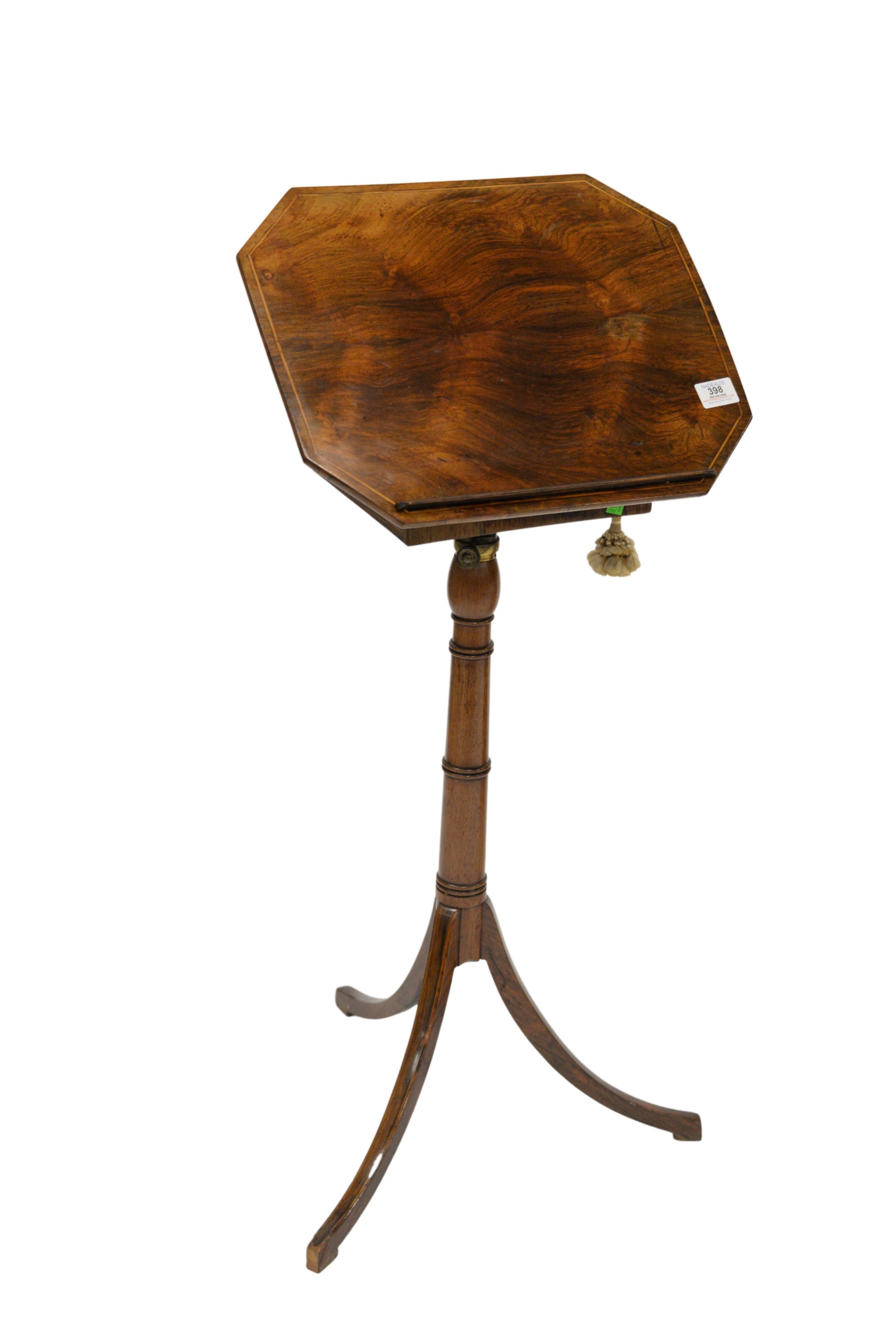 Regency Inlaid Rosewood and Mahogany Adjustable and Tilting Bookstand, having one side drawer set on turned shaft with brass fitting, ending in three downswept members, height 31 inches, top 14″ x 17″. Provenance: Sotheby’s N.Y. April 1984, lot 878A.