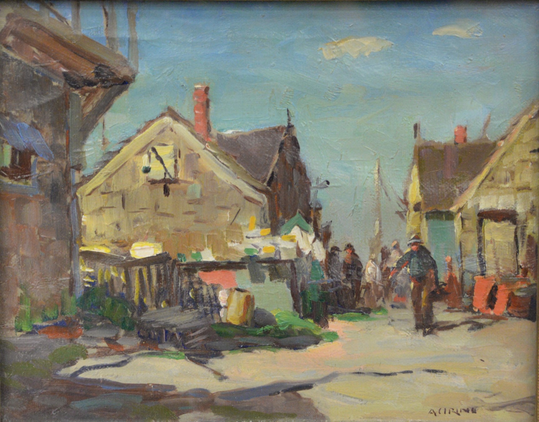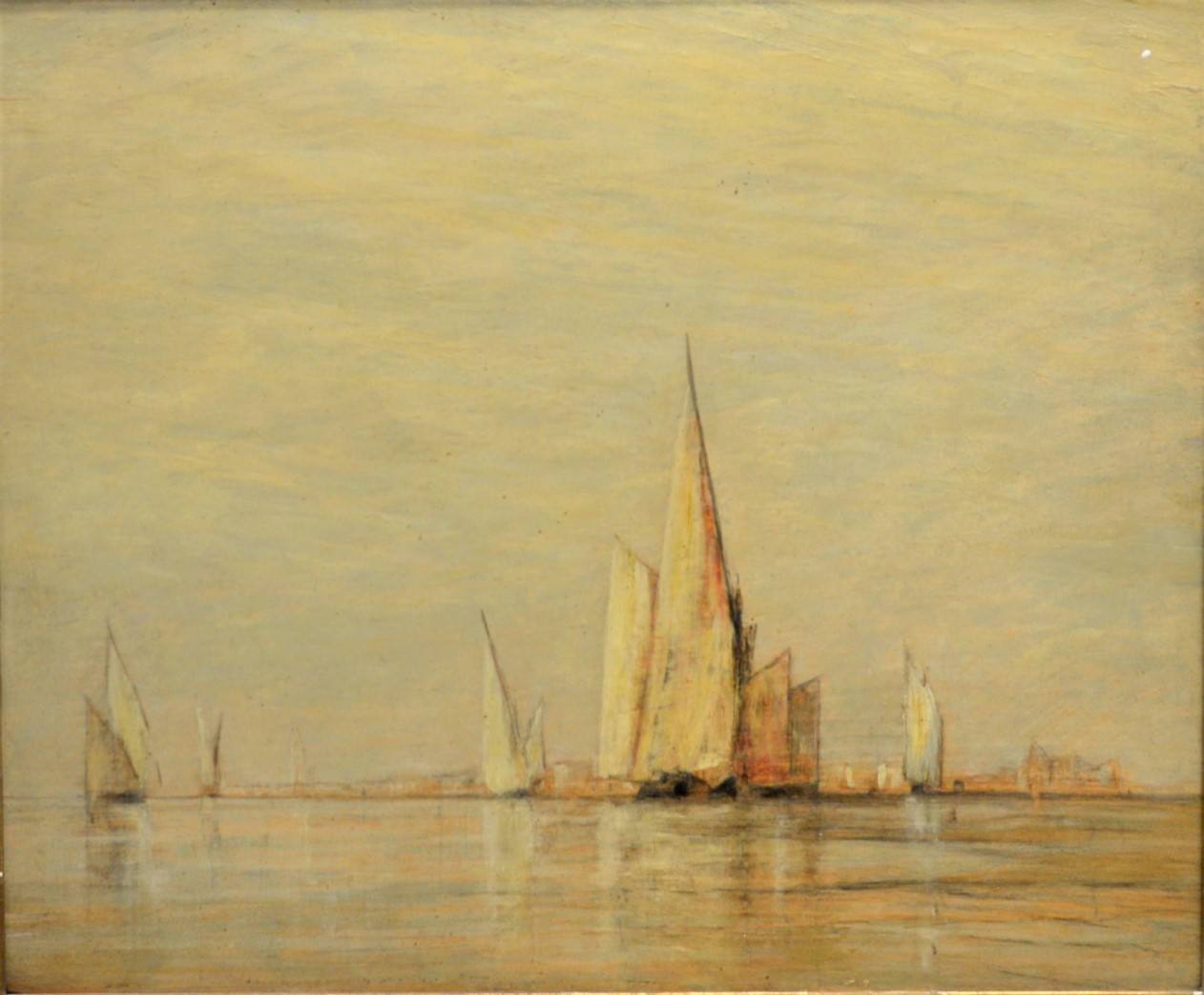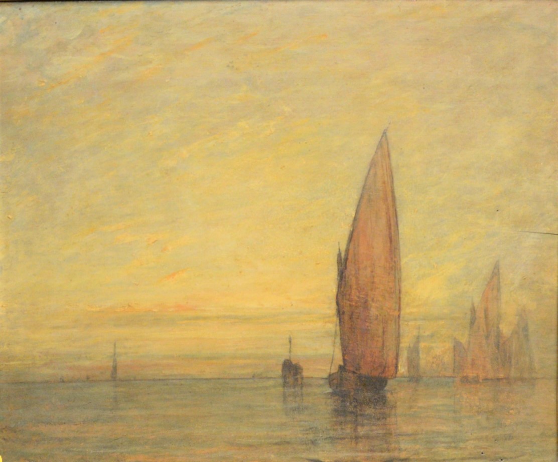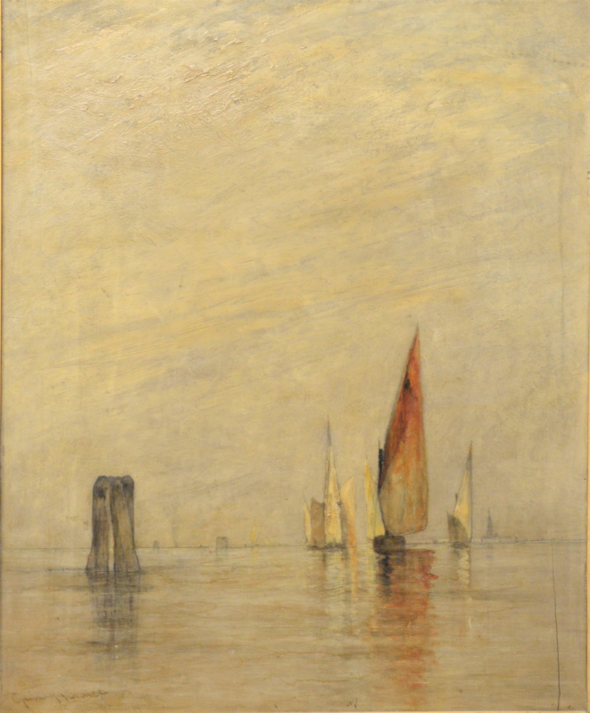 label on back with artist name and title, “Venetian Boats, William Gedney Bunce to East Washington Square to New York”, on cribbed board, 14″ x 17″.
